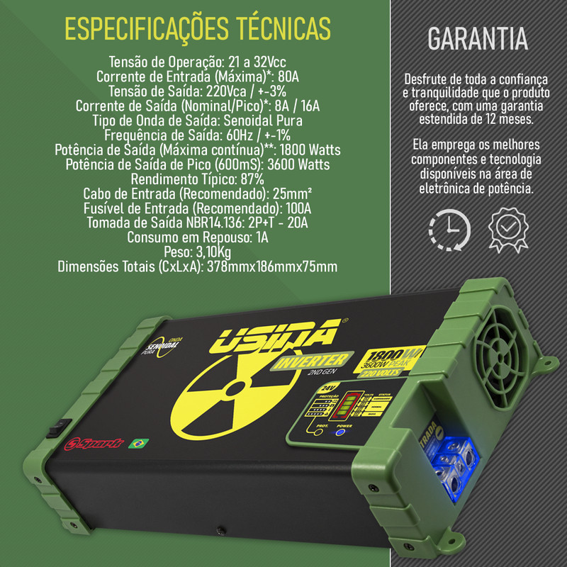 Inversor Usina 1800W 24V para 220V Onda senoidal Pura