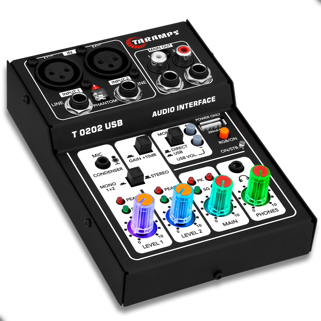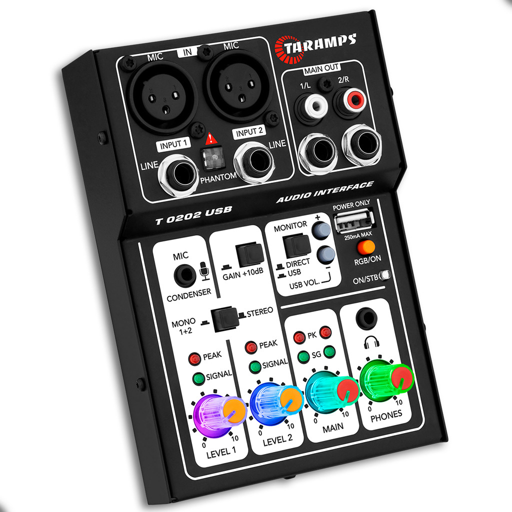 Mesa de Som Interface USB T0202 - PRETO - 2 Canais RGB XLR P10 Phantom Power 48v Taramps