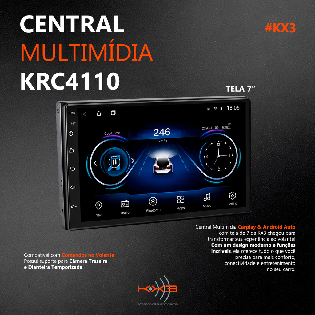 Central Multimídia KRC4110 7 Polegadas 2DIN Android 13 CarPlay Espelhamento Sem Fio Octacore 64GB Bluetooth Wi-Fi