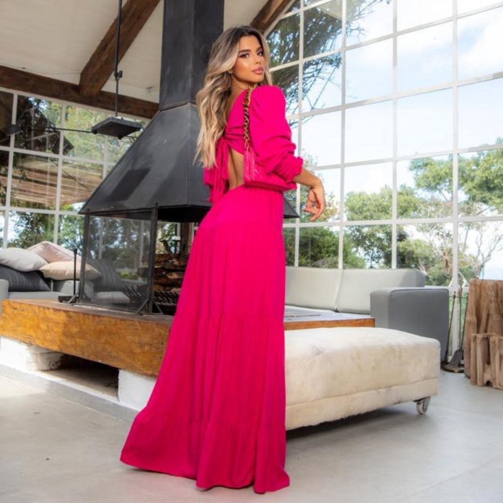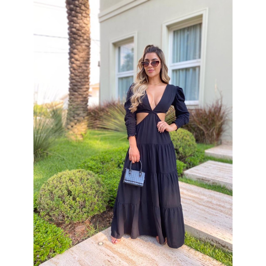 Vestido Feminino Longo Soltinho em Viscose Com Recorte Nas Laterais Manga Longa Bufante Decote Em V Moda Tendência