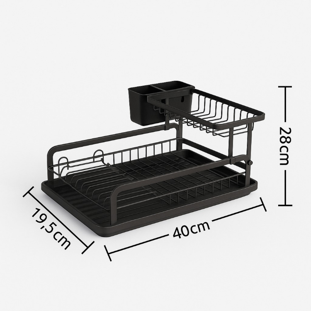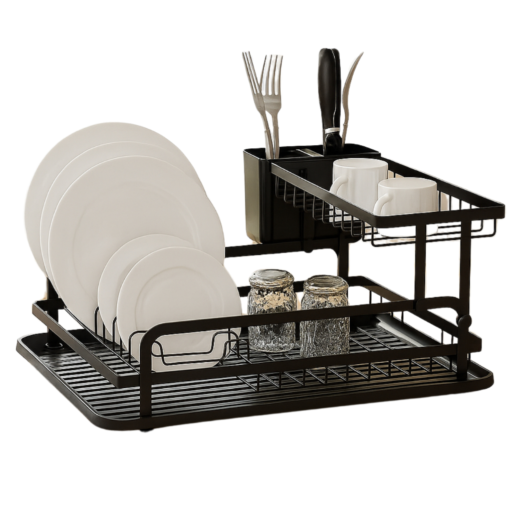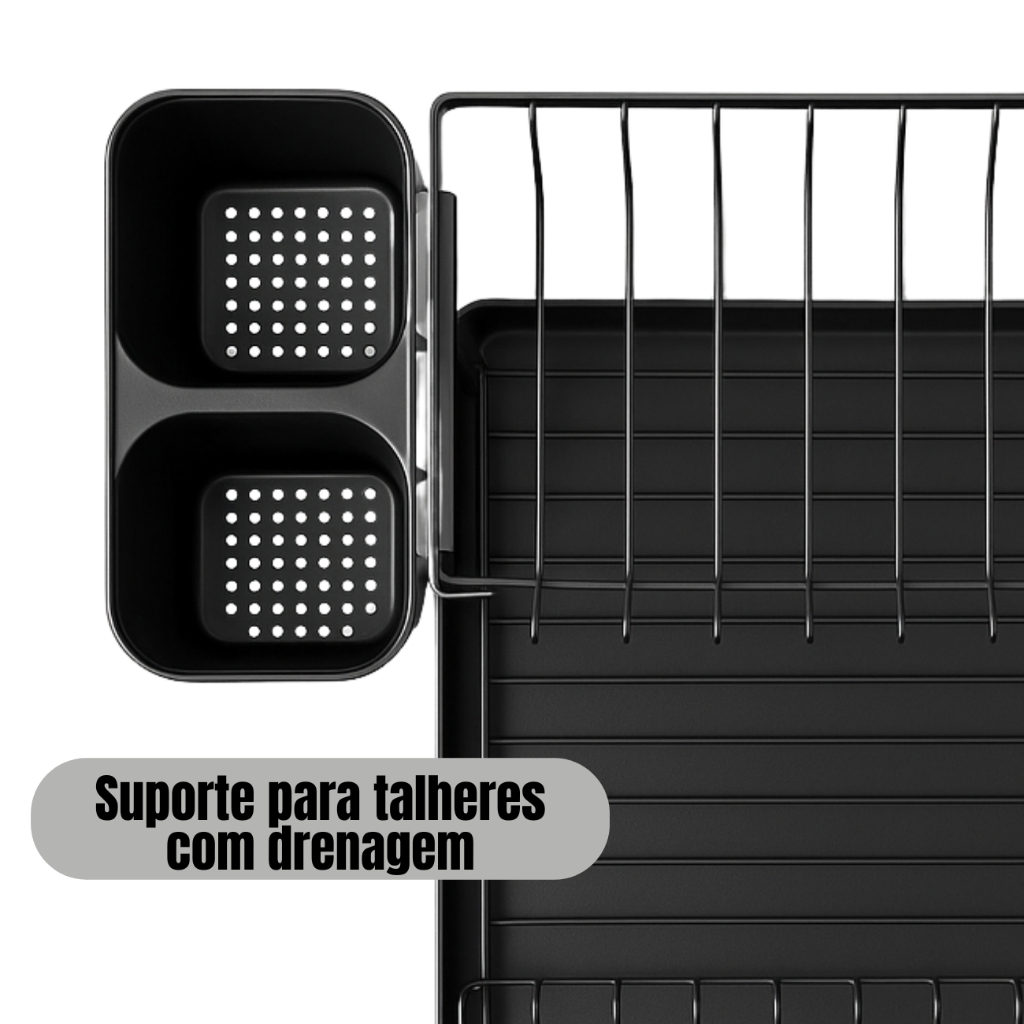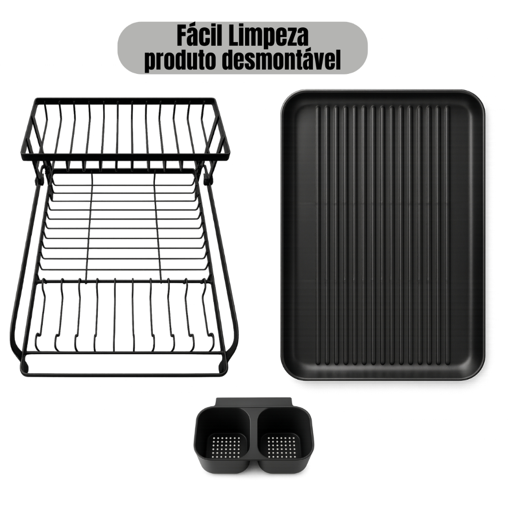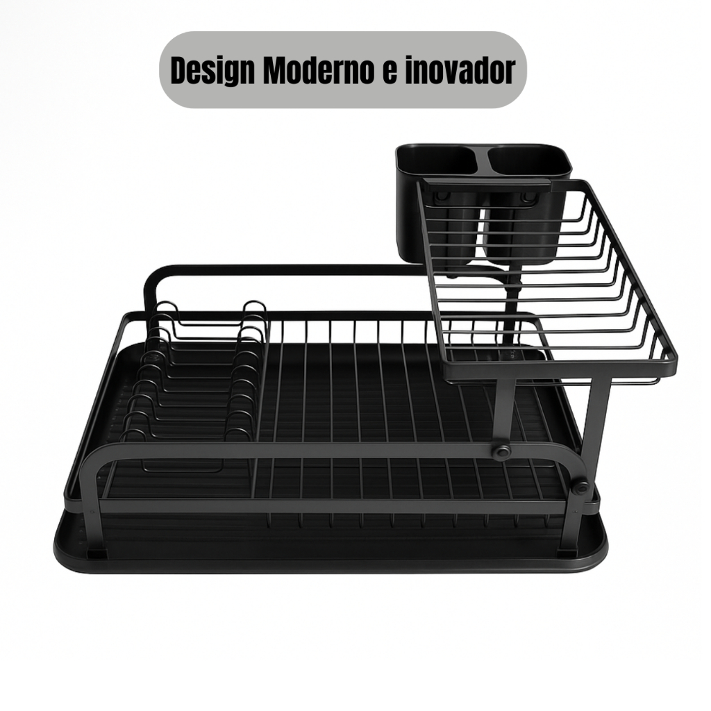 Escorredor de Louças 2 Andares Duplo Com Porta Talheres e Copo Organizador Preto Aço