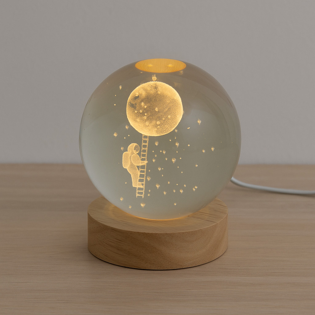 Luminária Crystal Ball 6cm com Base de Madeira – Esfera Decorativa 3D com Luz Quente