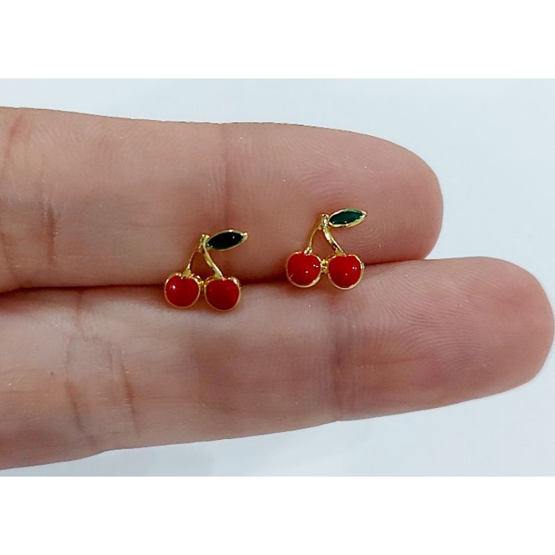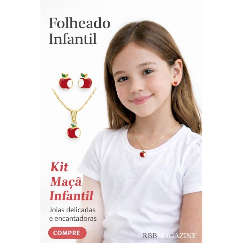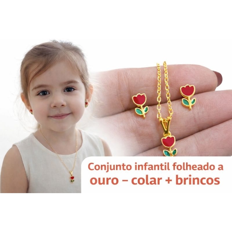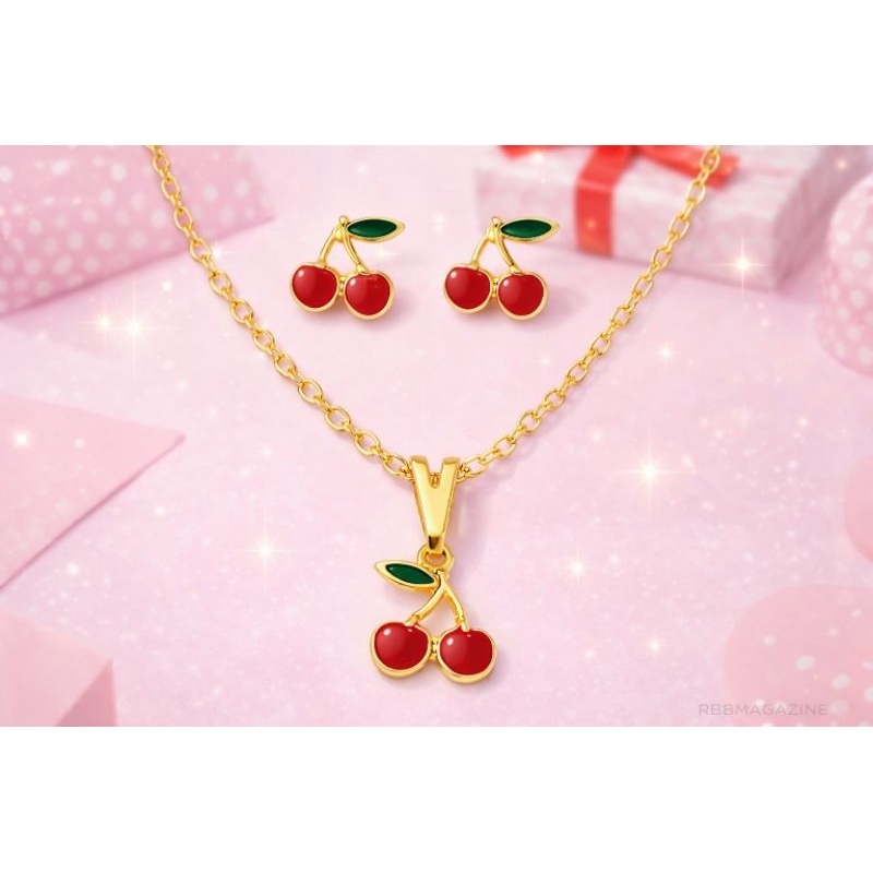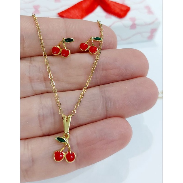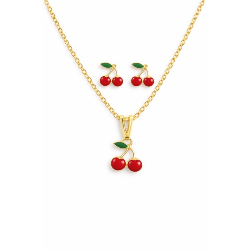 Conjunto Colar e Brinco infantil menina cereja folheado a ouro 18k