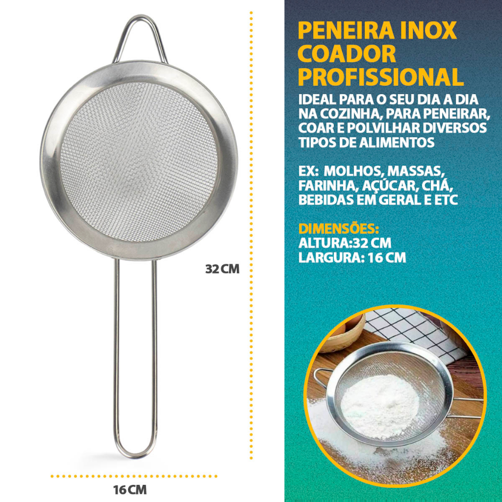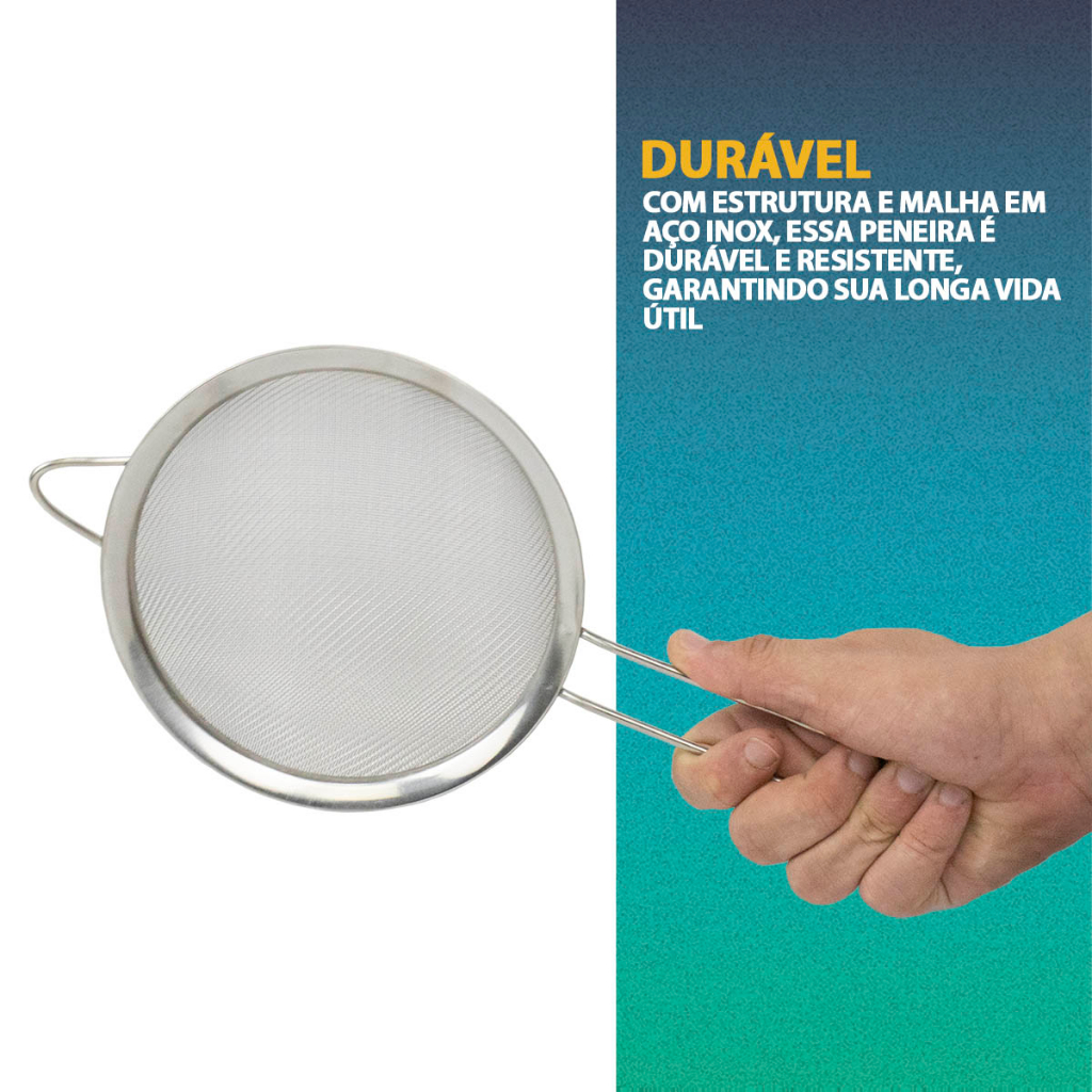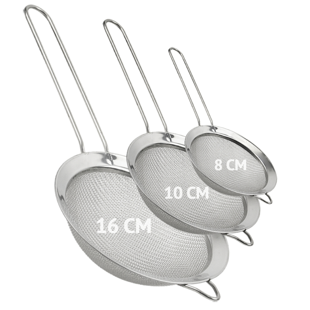 Kit 3 Peneira Coador Em Aço Inox Para Cozinha Tamanho P M G 8/10/12/16cm Polvilhar Açúcar Farinha