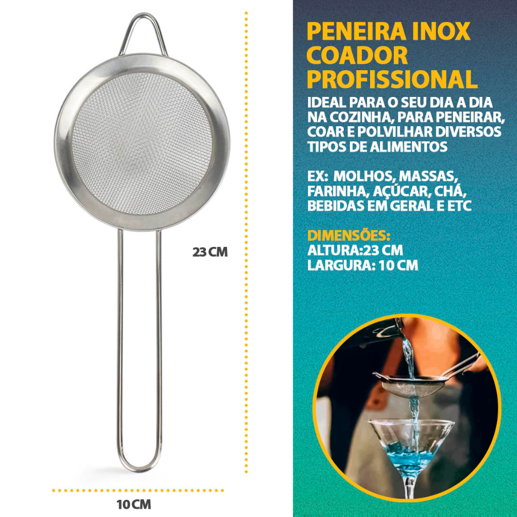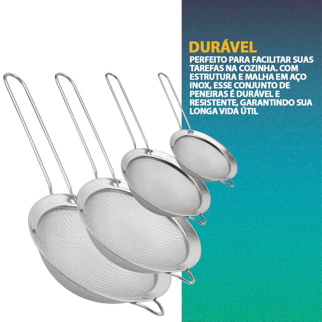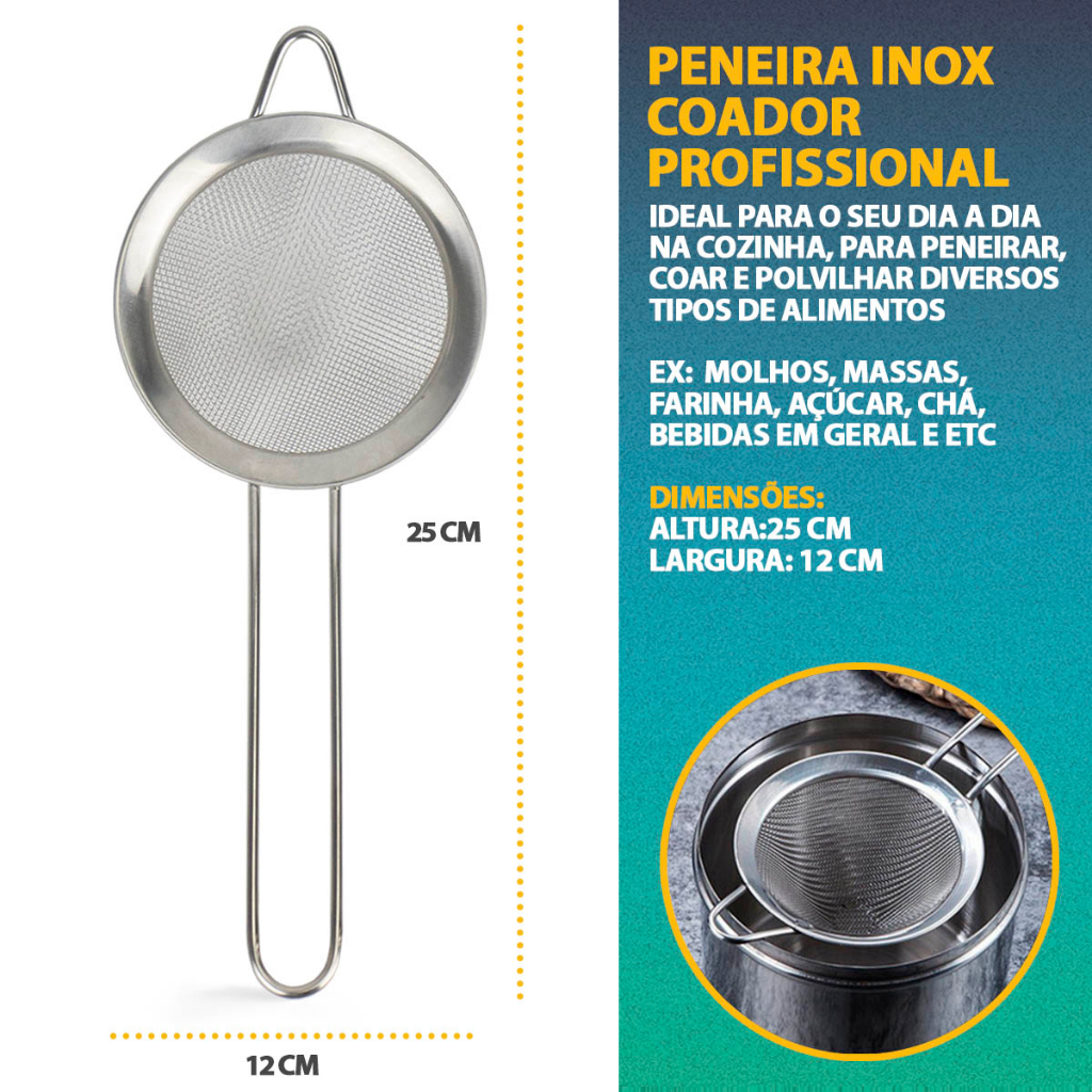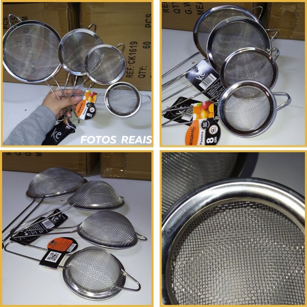 Kit 3 Peneira Coador Em Aço Inox Para Cozinha Tamanho P M G 8/10/12/16cm Polvilhar Açúcar Farinha