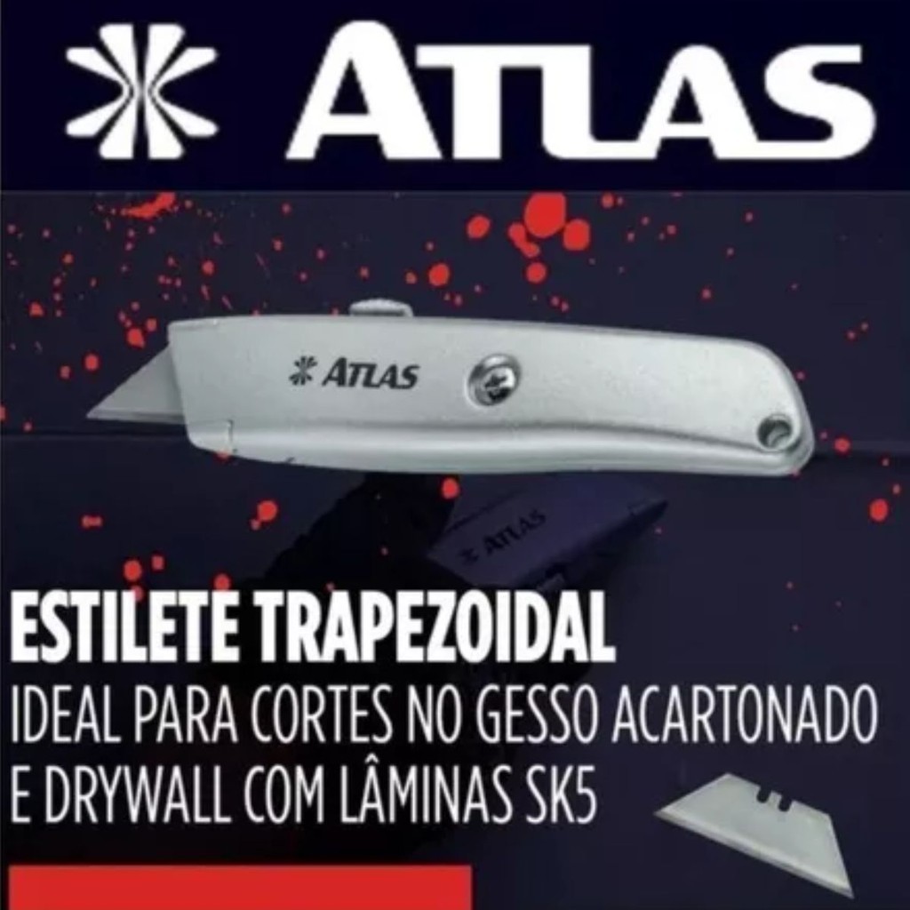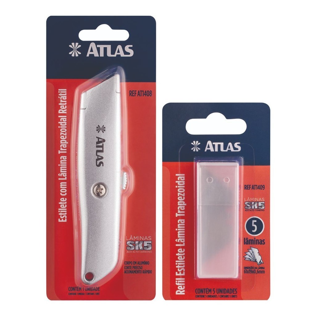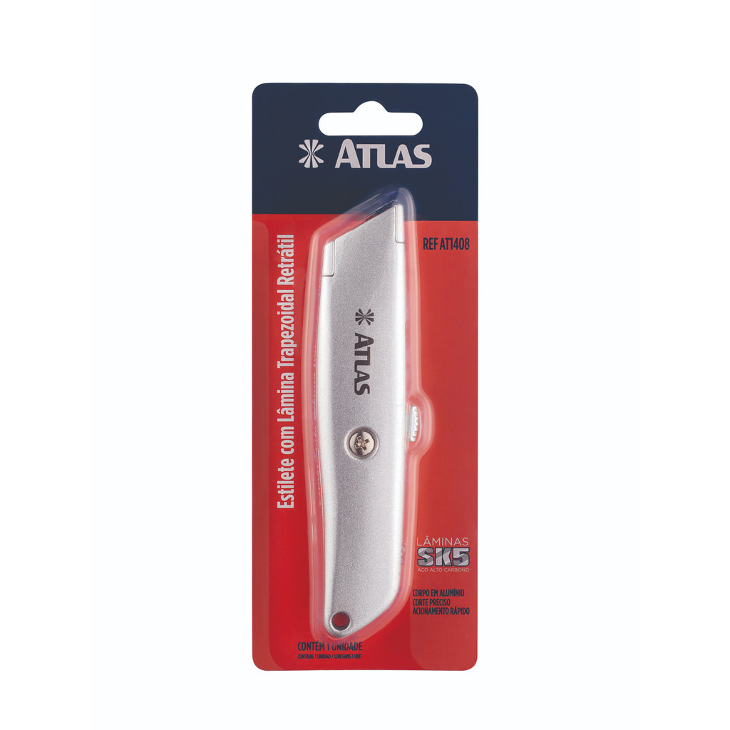 Estilete Trapezoidal Profissional Cabo Alumínio Com 5 Lâminas Extra Em Aço SK5 Com Alto Teor De Carbono AT1408 - Atlas