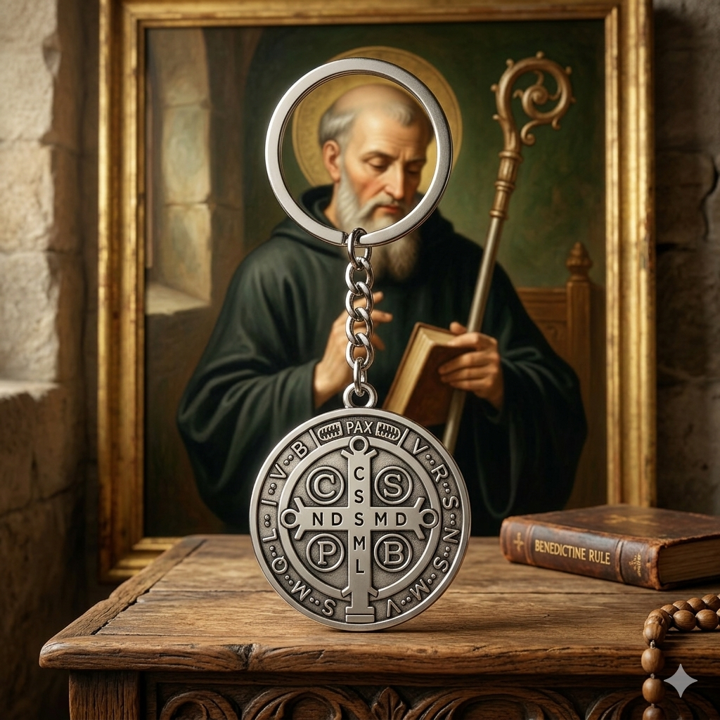 Chaveiro Medalha Escudo São Bento Em Metal Cor Prata - Unidade