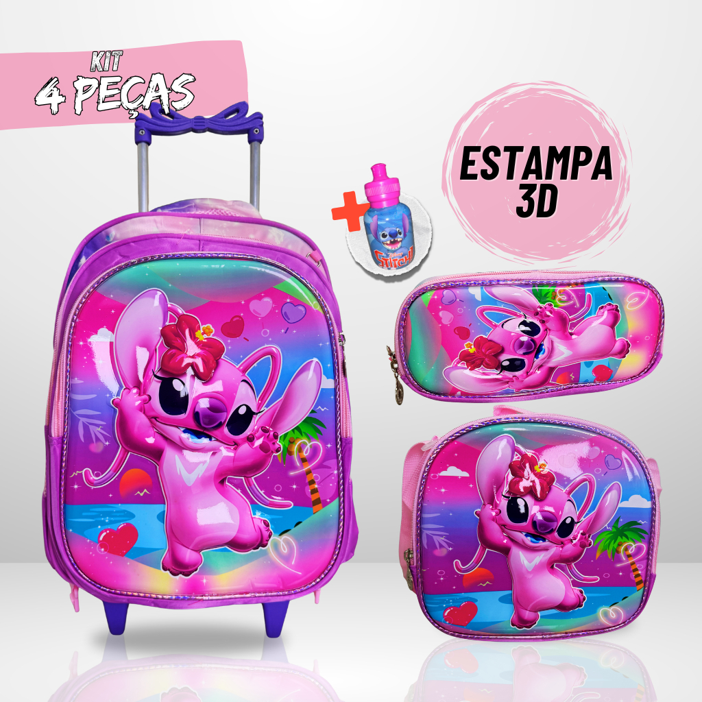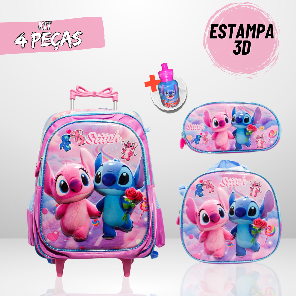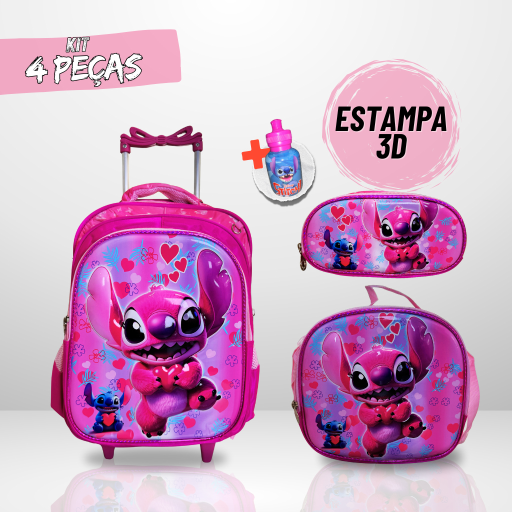 Mochila Escolar de rodinha Stitch + Lancheira Térmica + Estojo + 3d