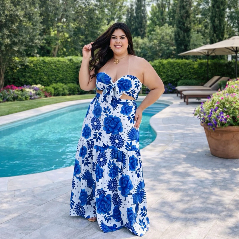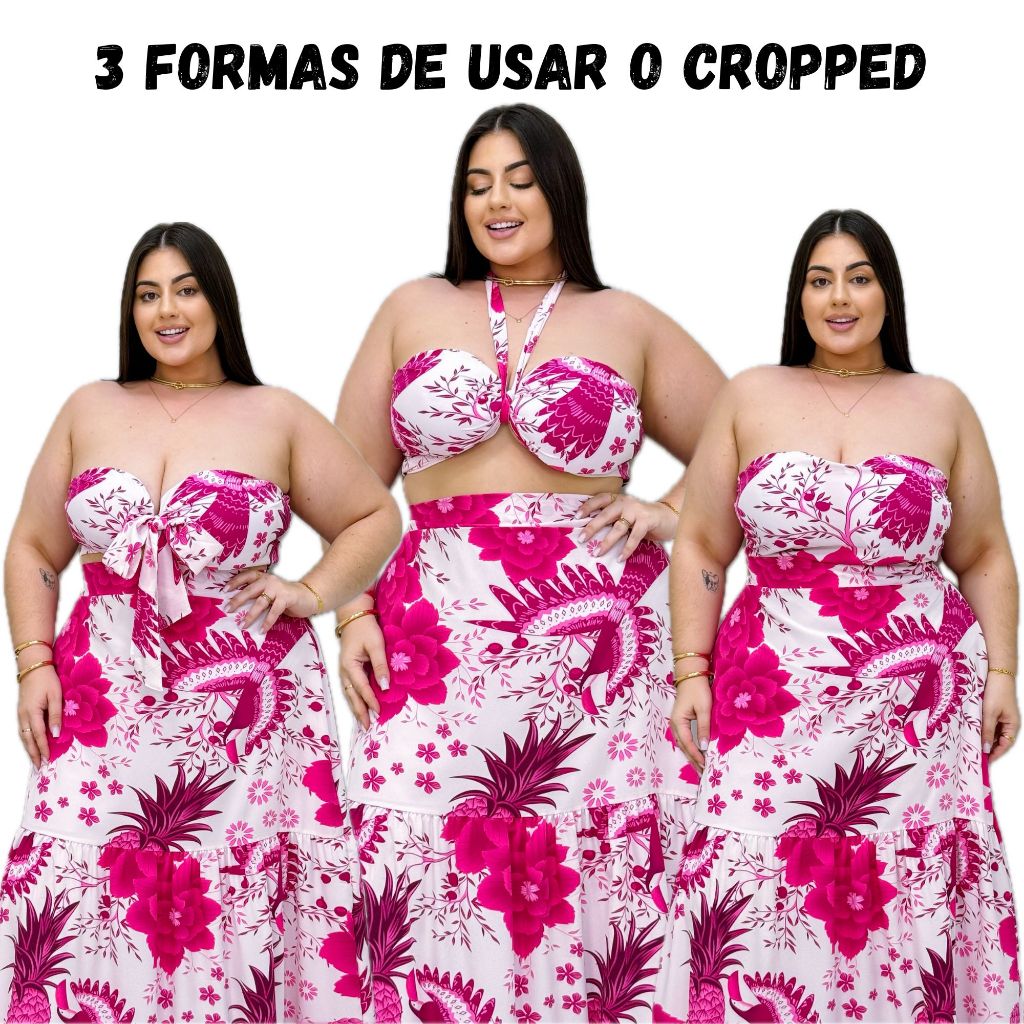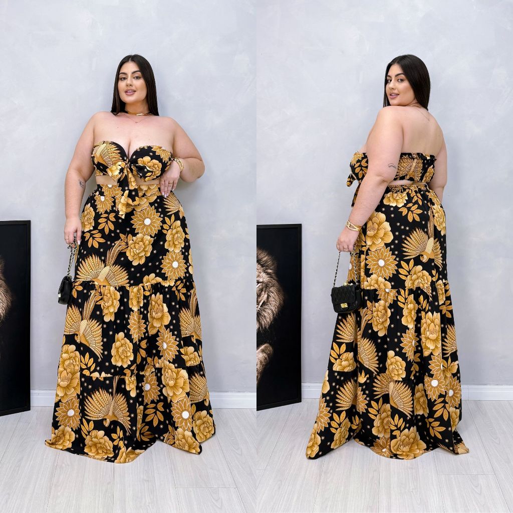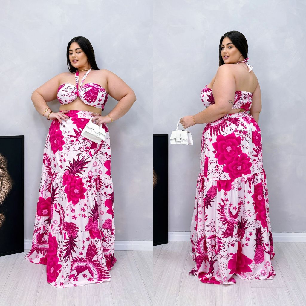 Conjunto Saia Longa e Cropped Plus Size Estampado