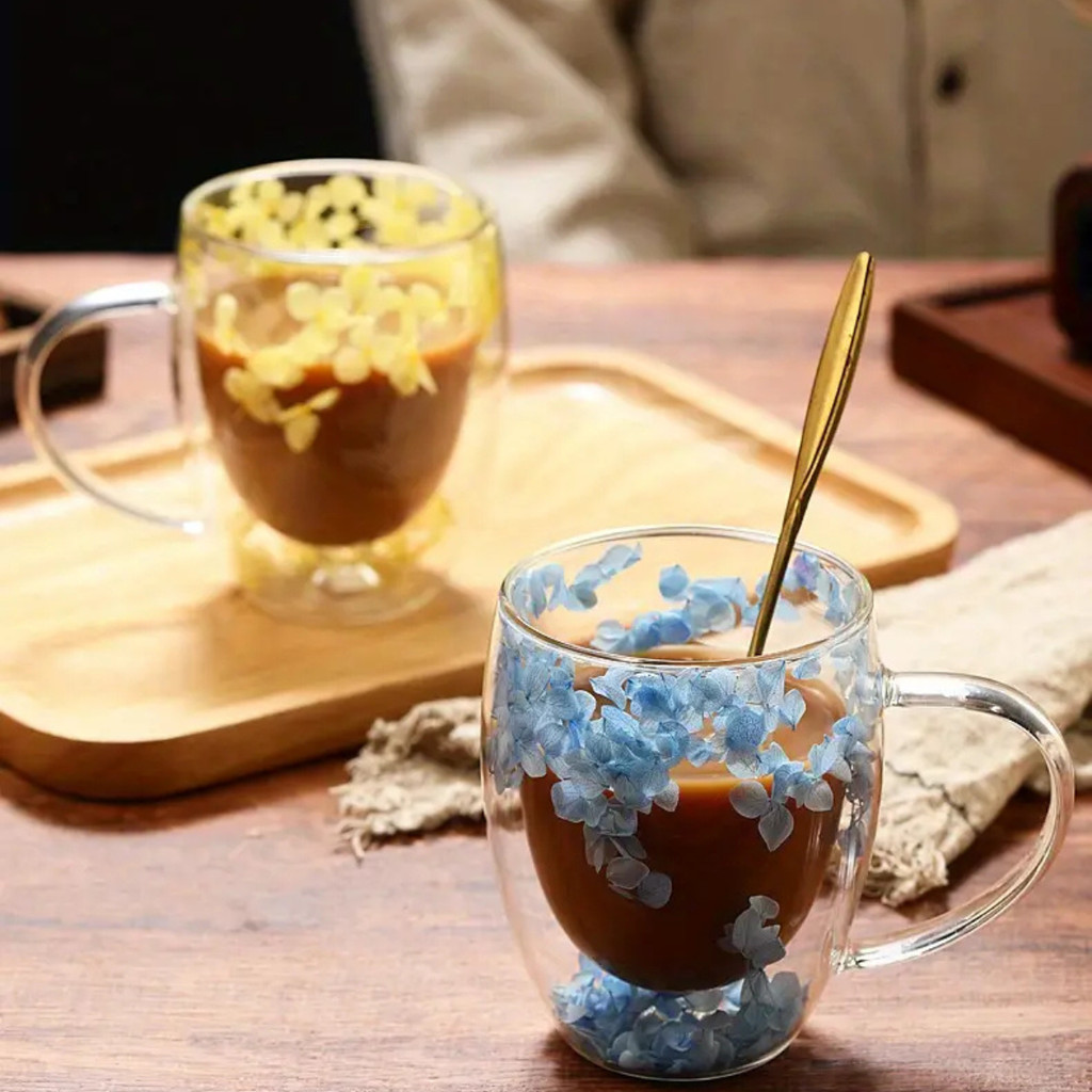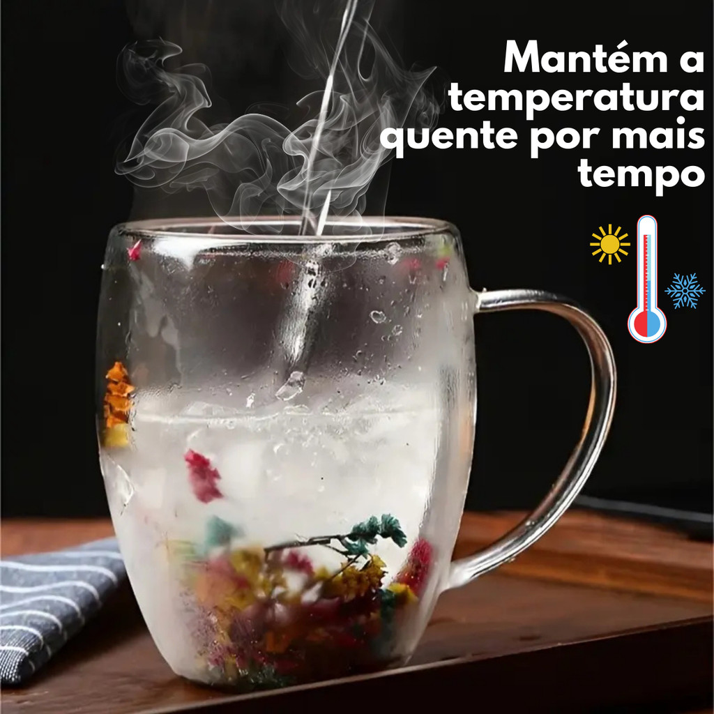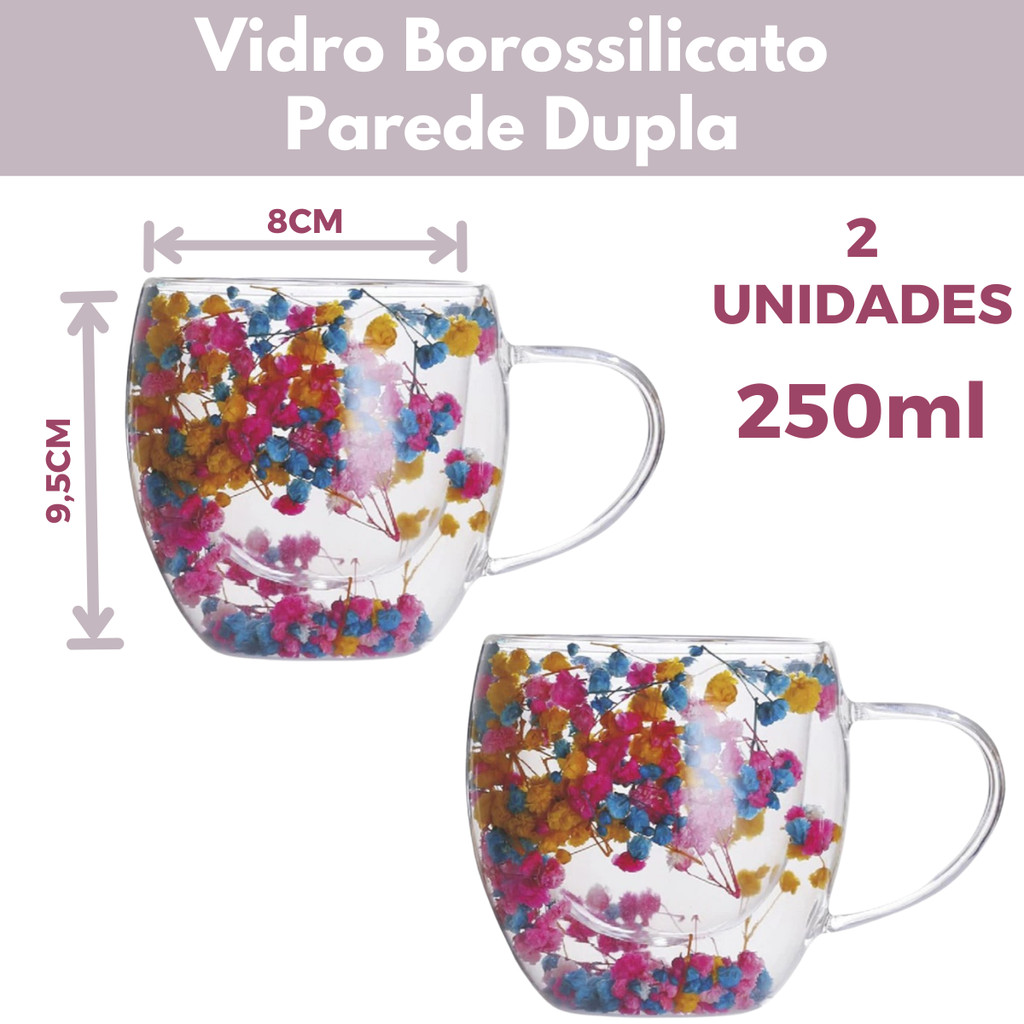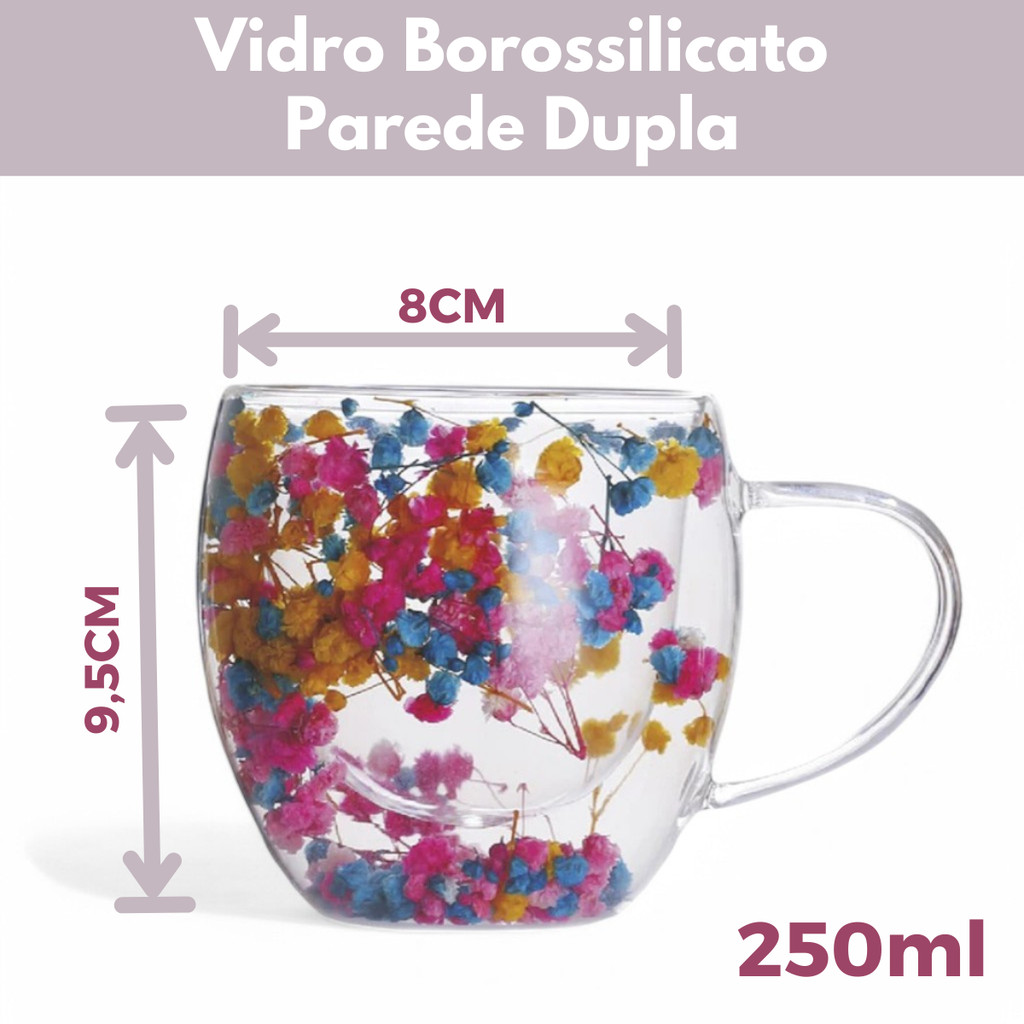 Caneca Xícara de Vidro Duplo com Flores Secas no Interior 250ml Sofisticada e Elegante
