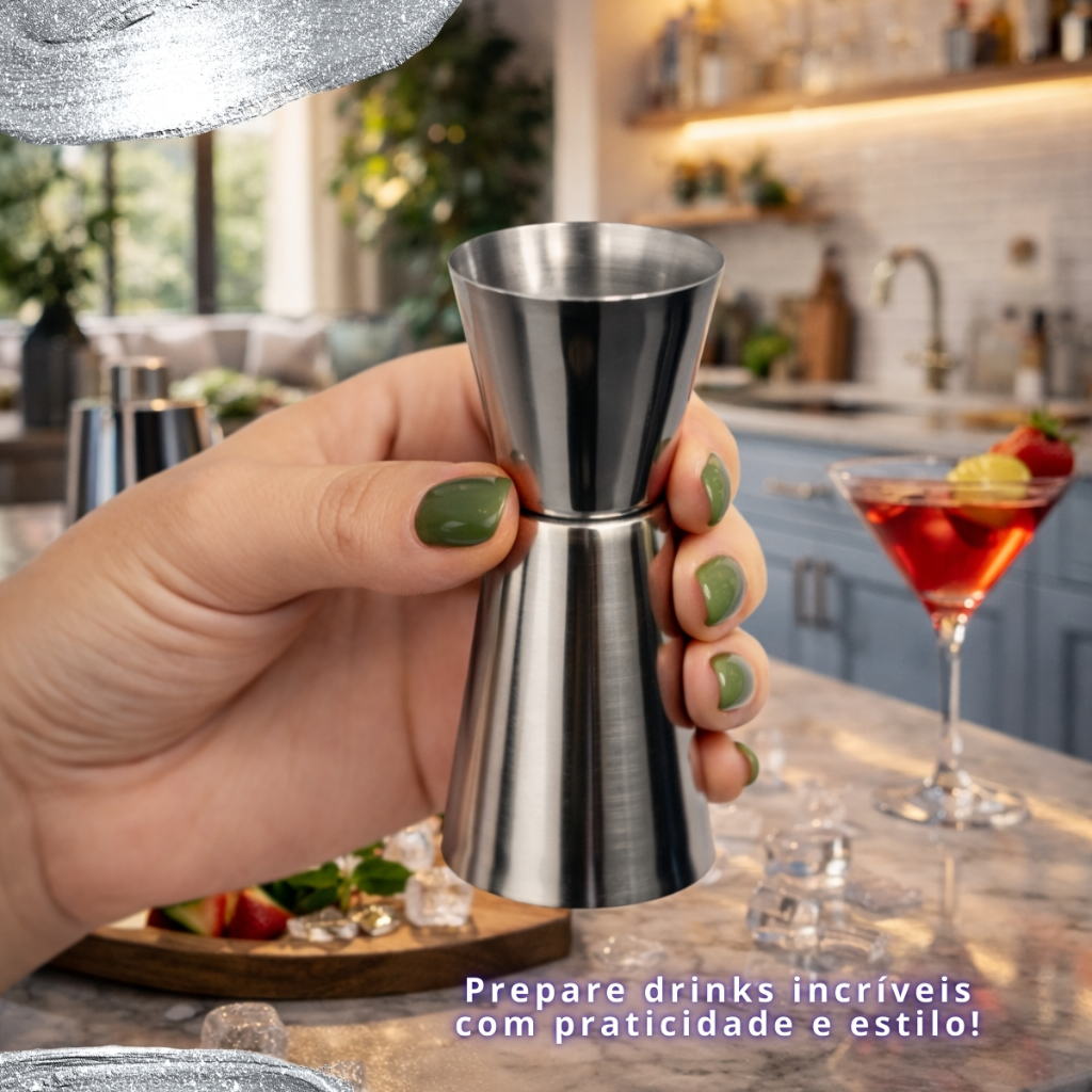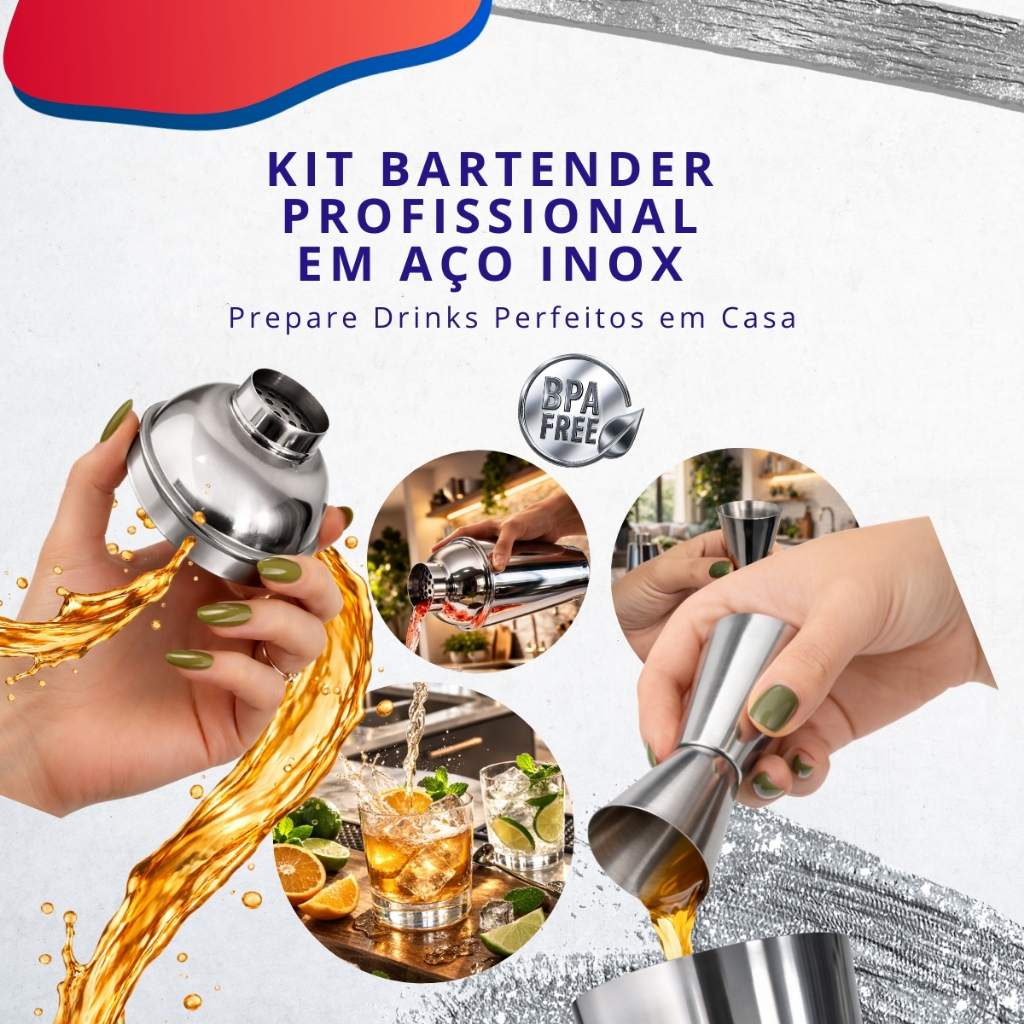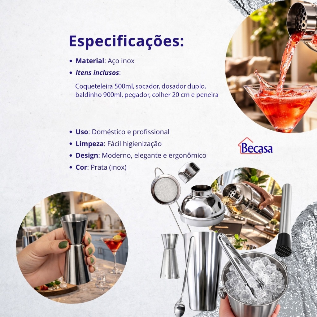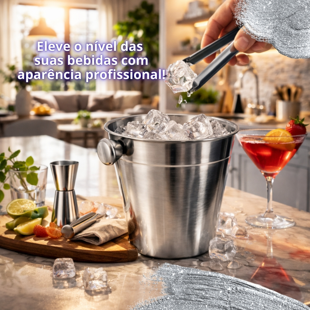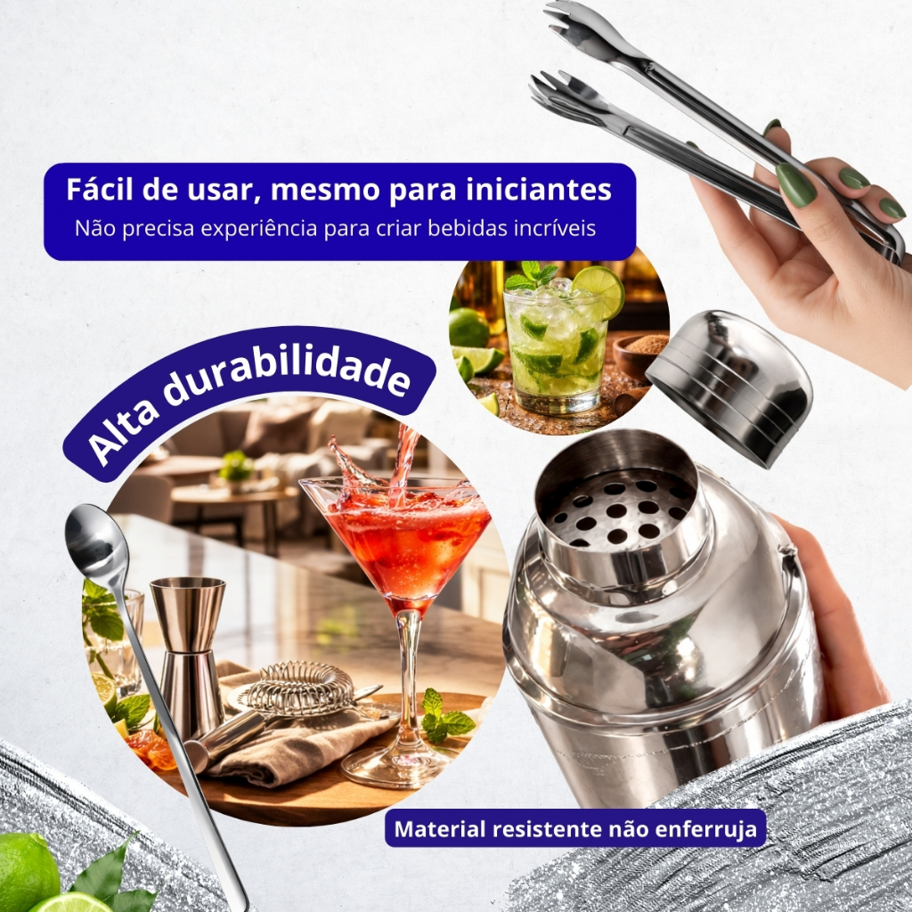 KIT Caipirinha Bartender 7 pçs Inox Coqueteira Socador Dosador Balde Colher Pegador Peneira Completo