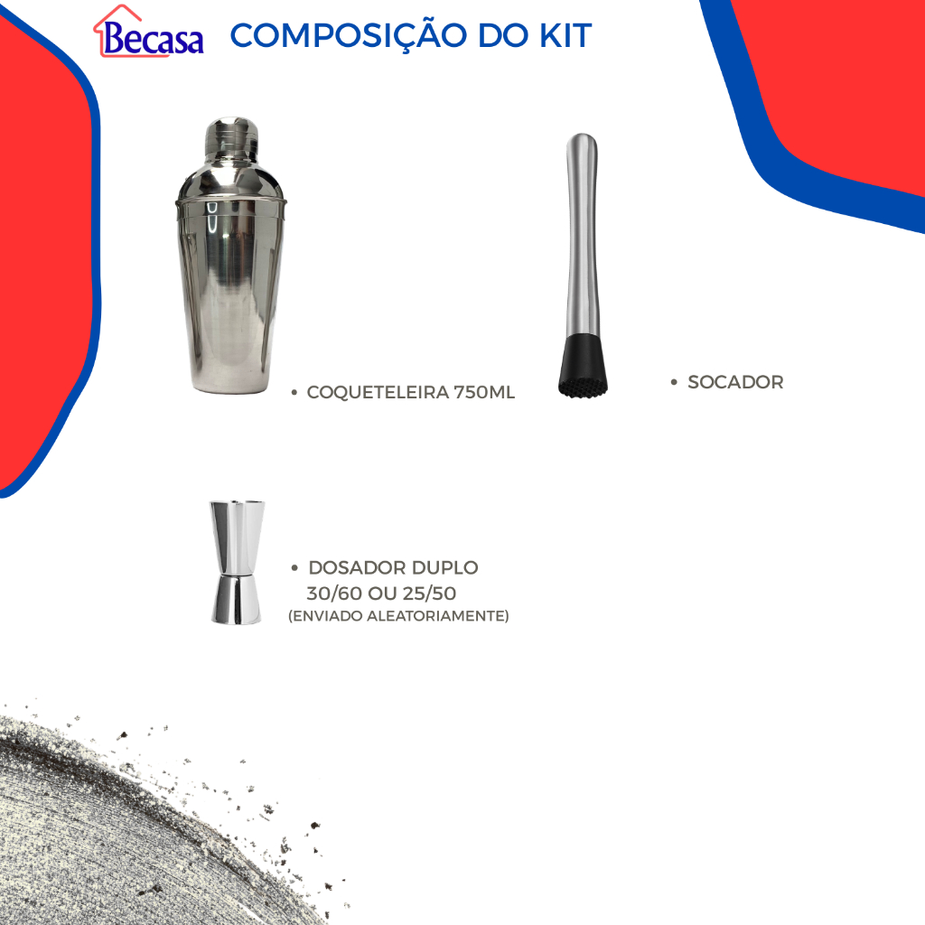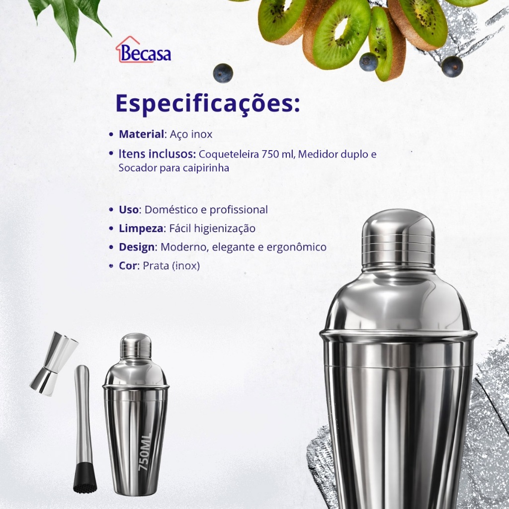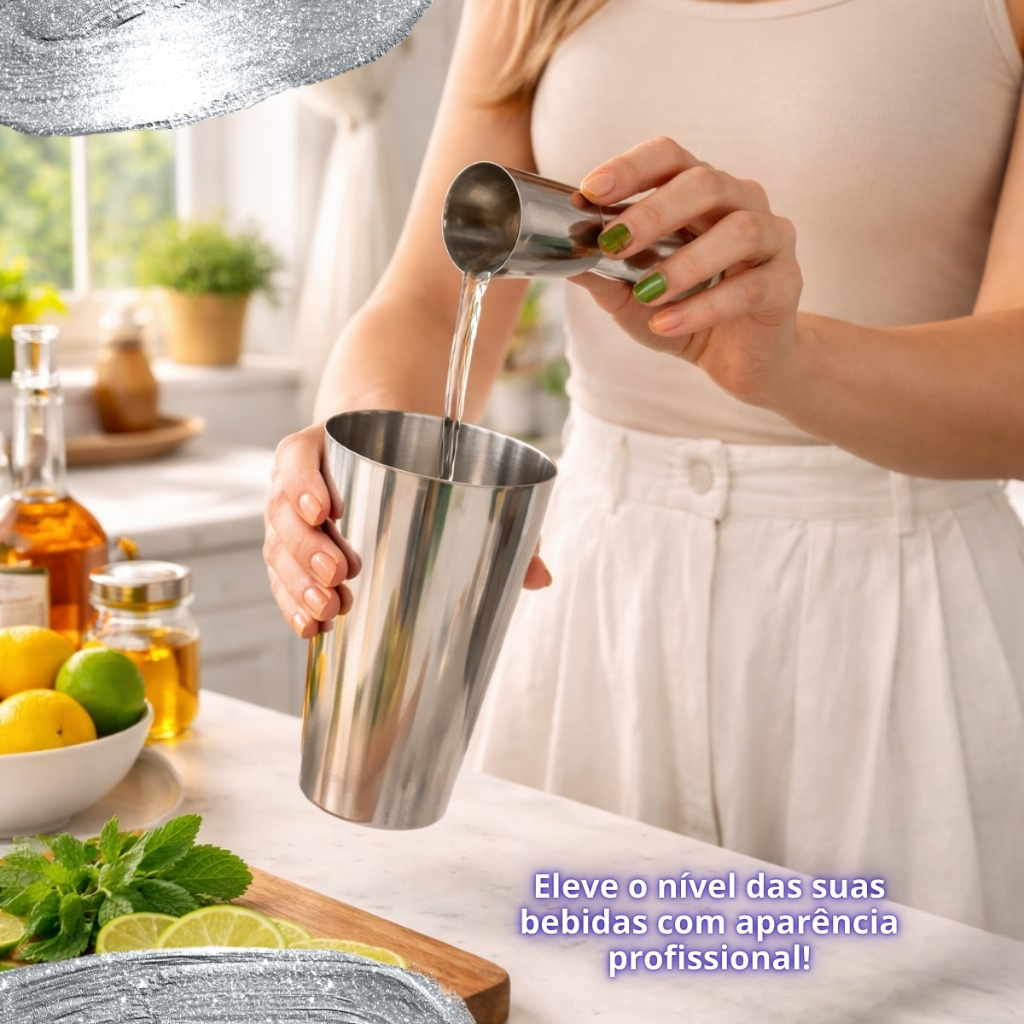 Kit Coqueteleira 750 ml + Socador+ Dosador Inox Profissional