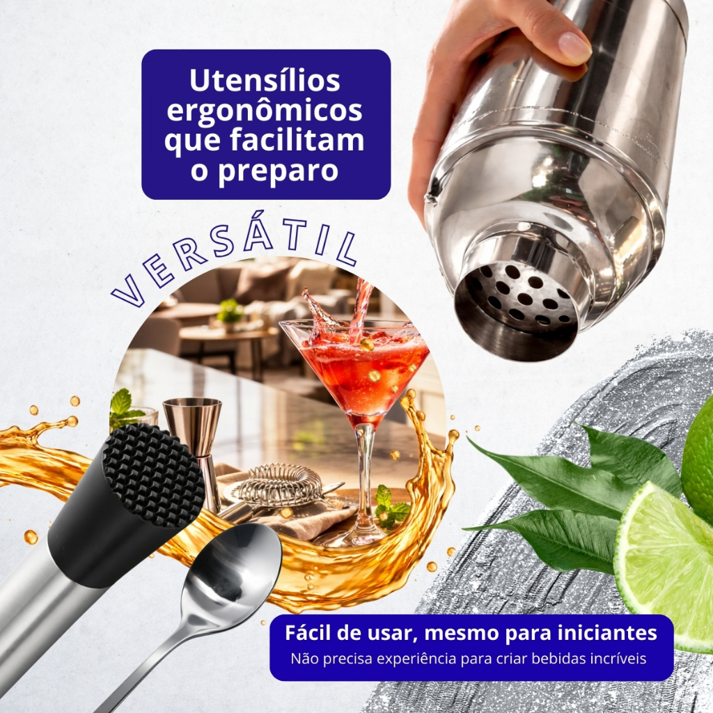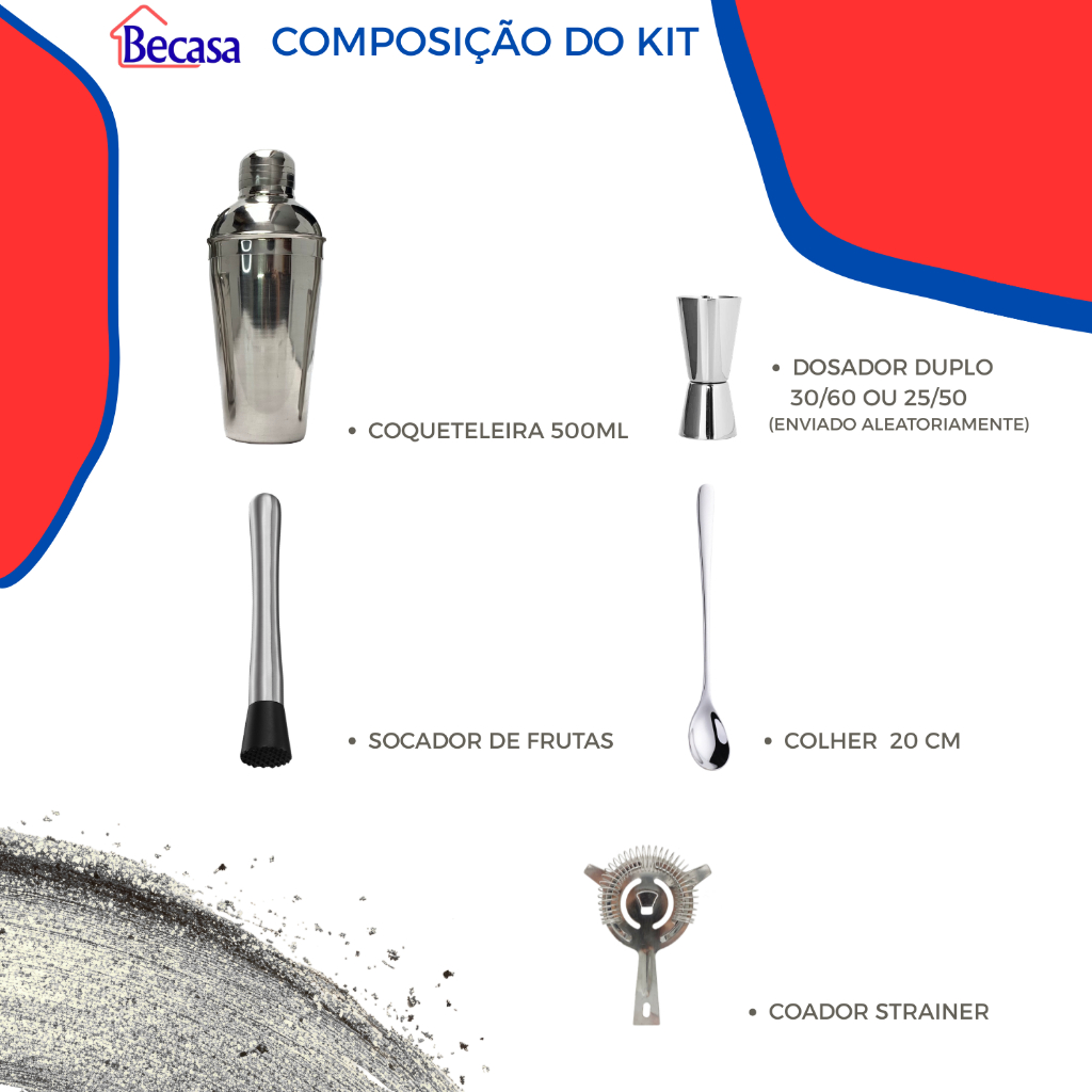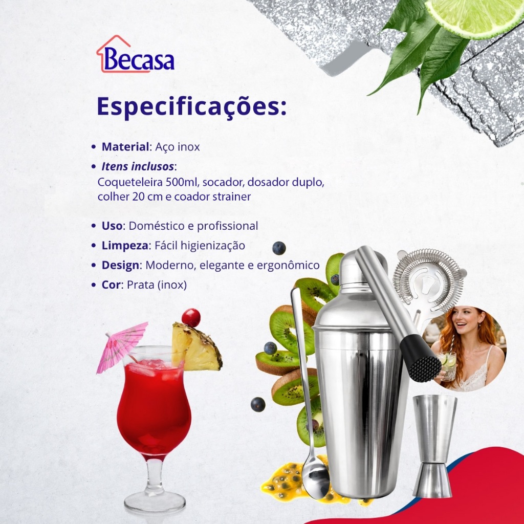 Kit Caipirinha Profissional Coqueteleira 500 Ml Barman Inox Coador Strainer Socador Dosador Colher