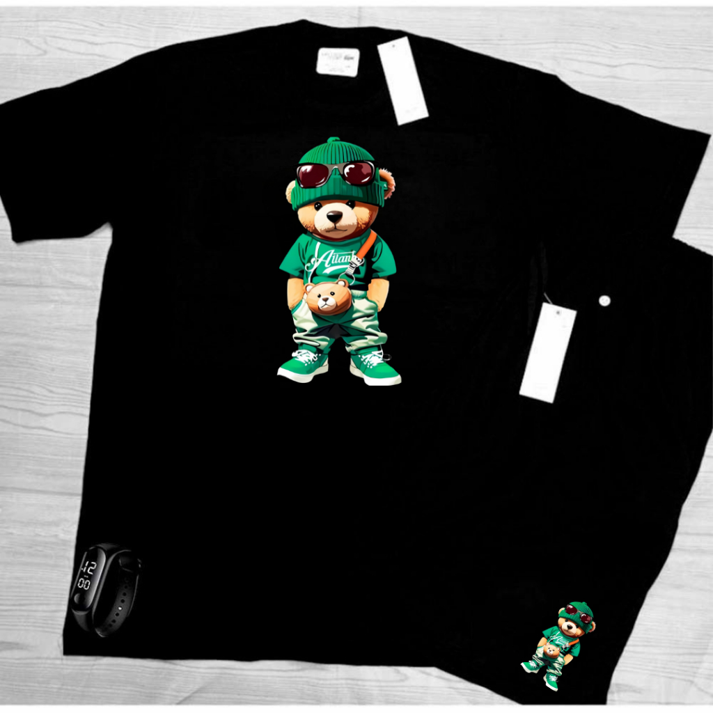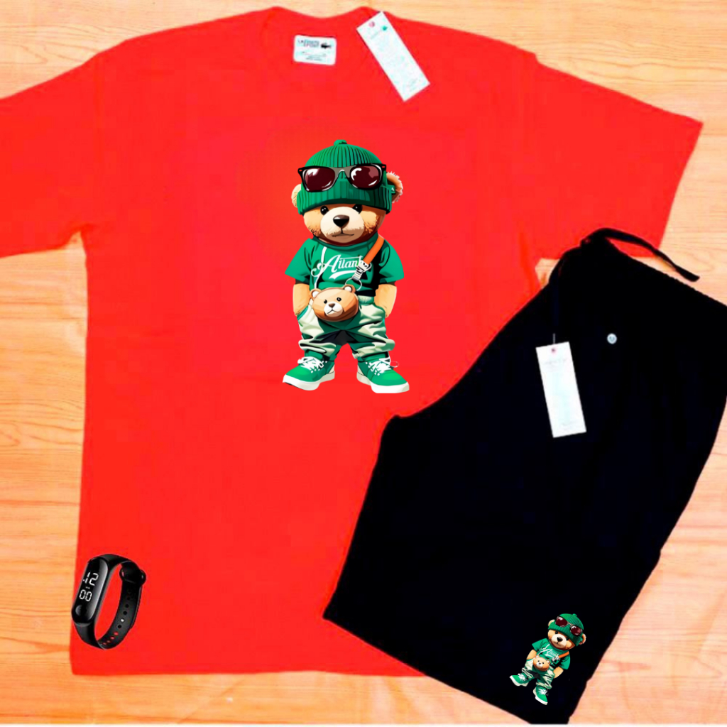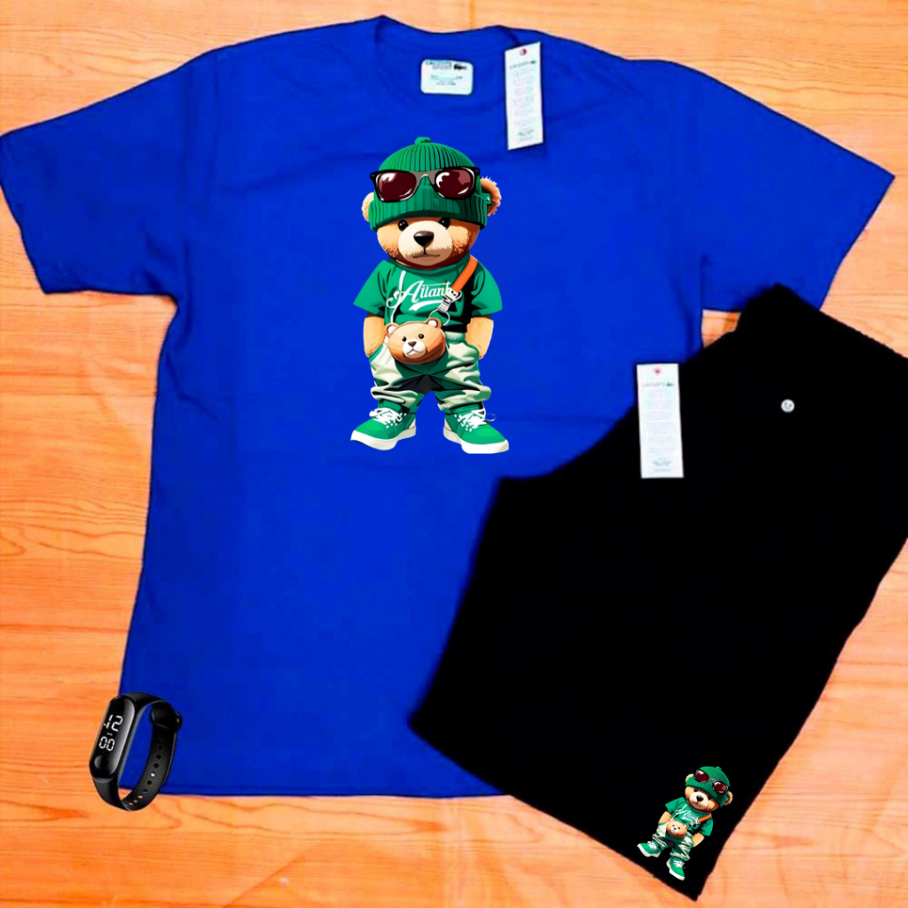 Conjunto Kit camiseta verão 100% algodão 30,1 bermuda leve para caminhada e academia URSO ESTILOSO + RELOGIO DIGITAL