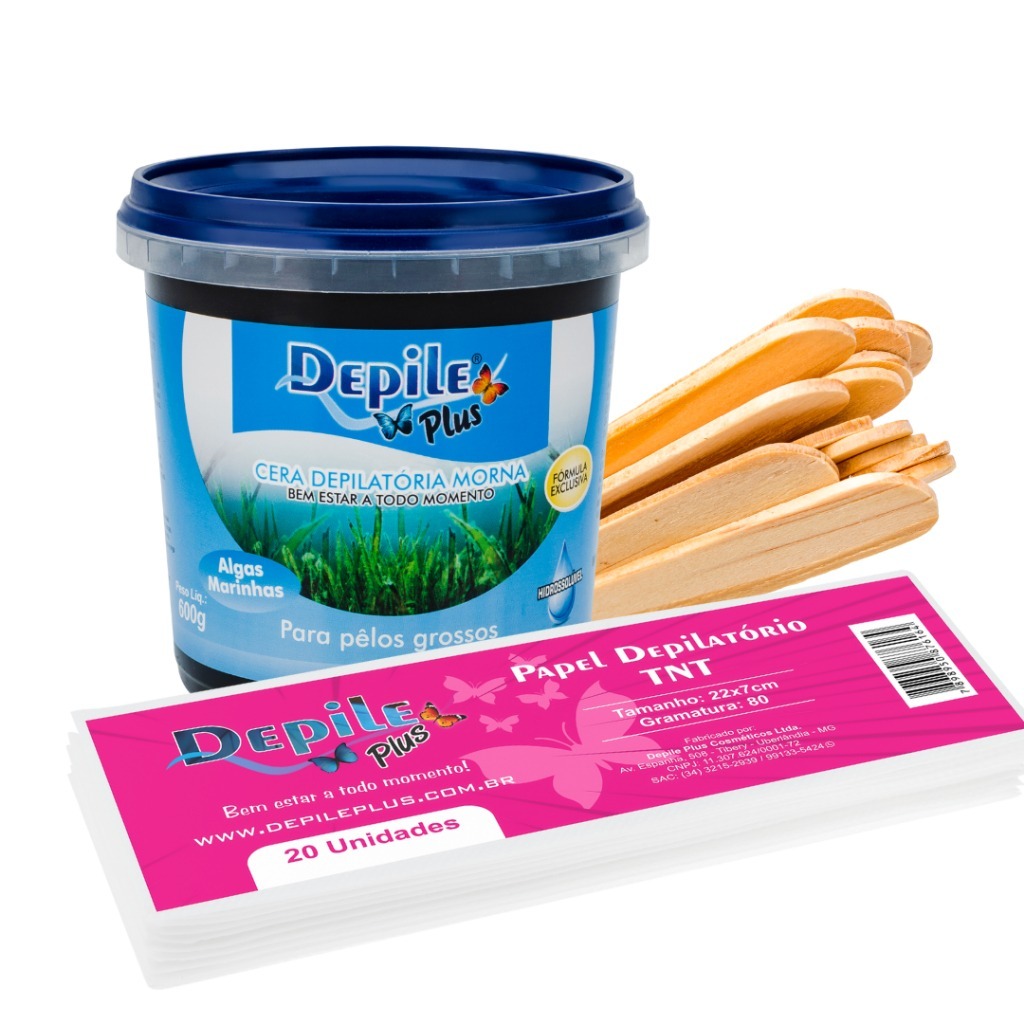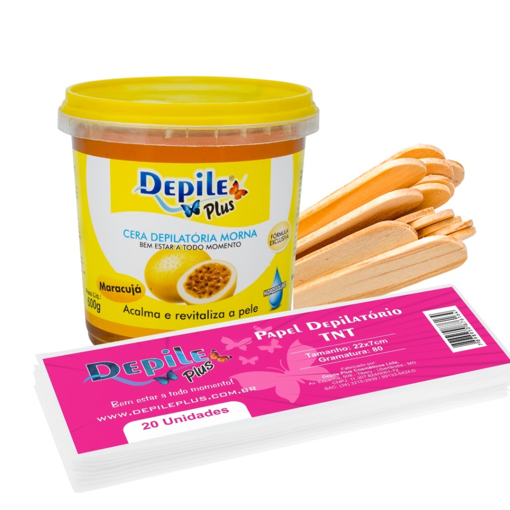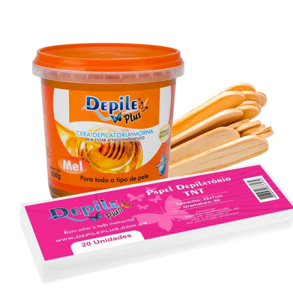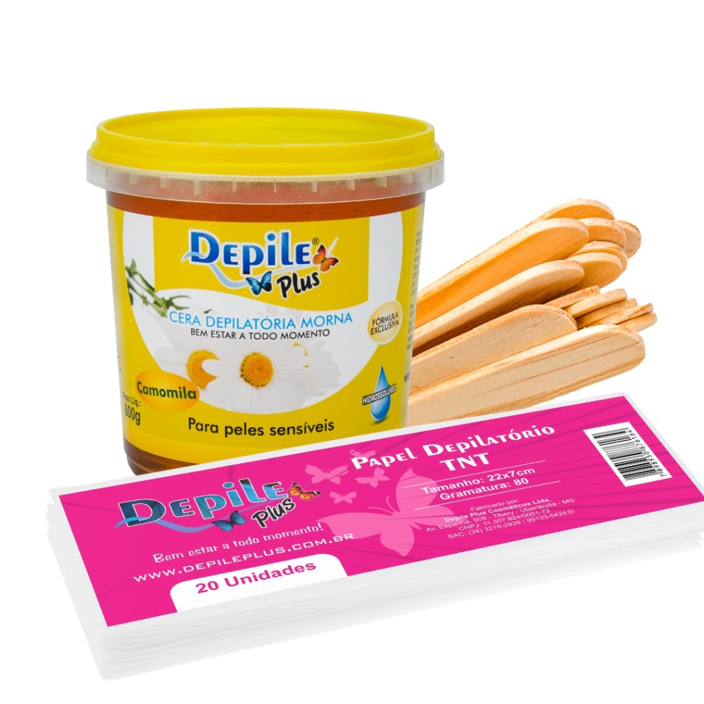 Kit Cera Depilatoria Hidrossoluvel 600g + Espátula Larga 15 Unidades + Papel Depilatorio 20 Unidades