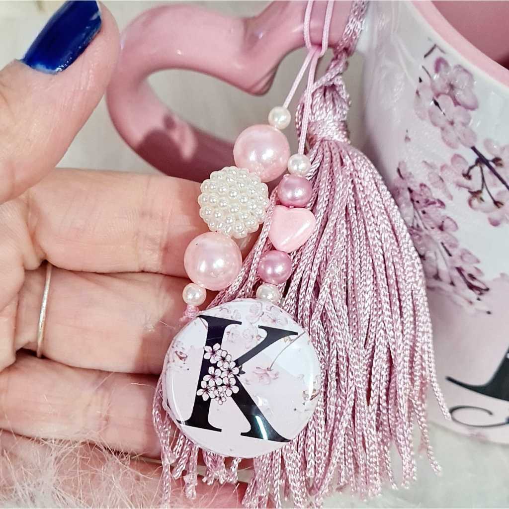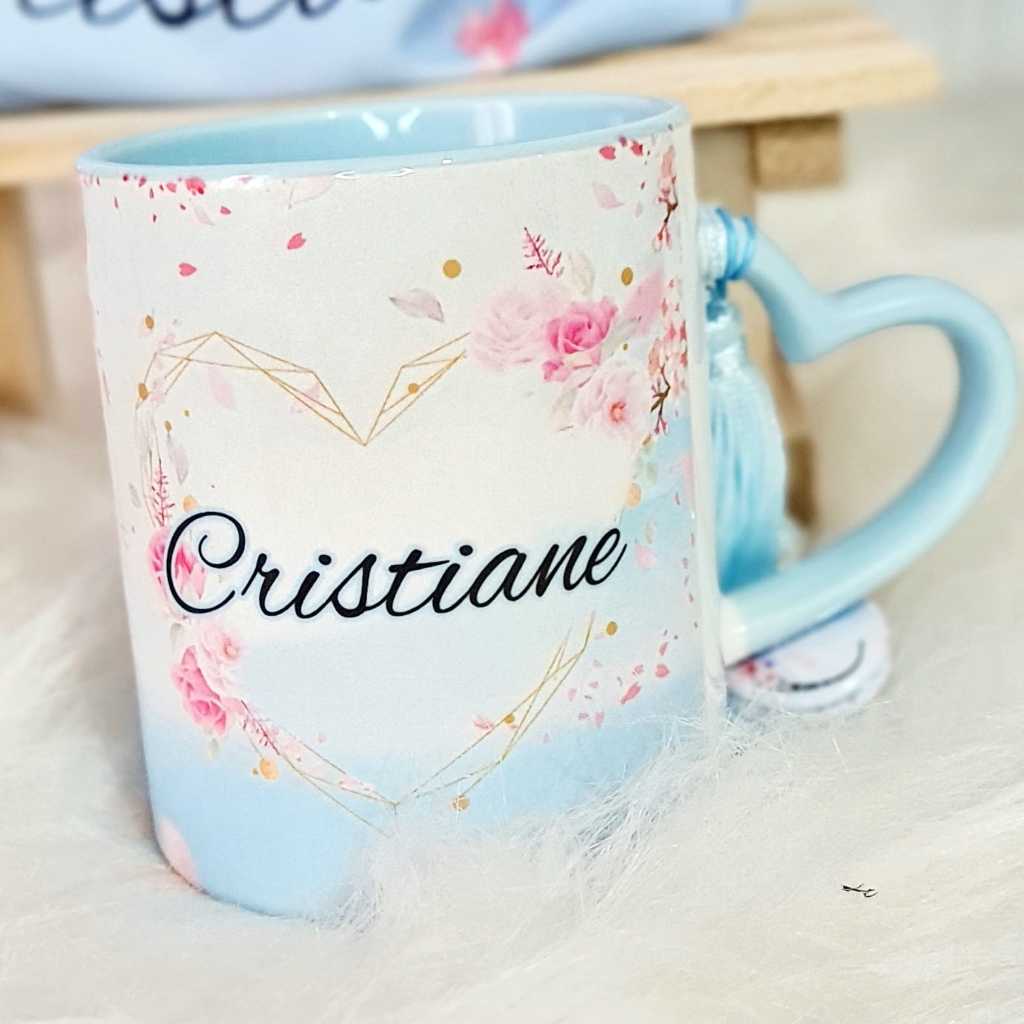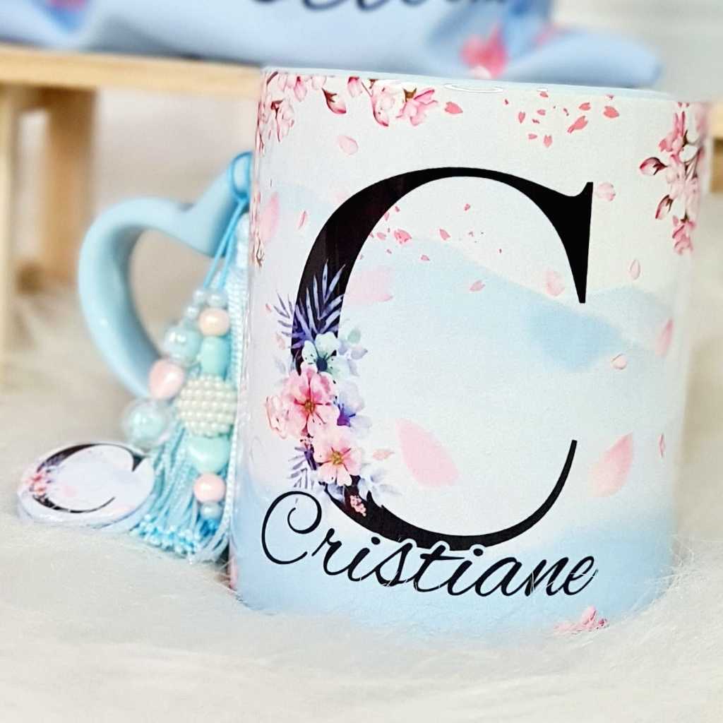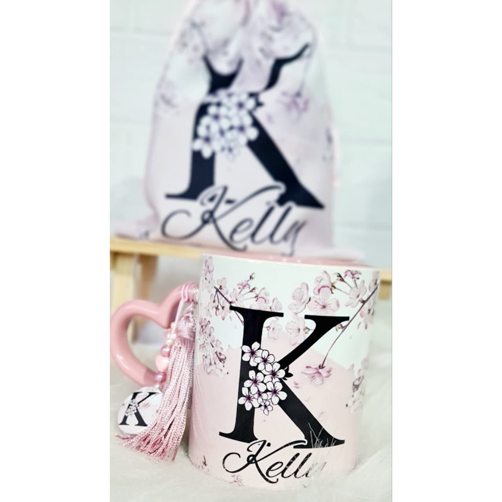 Caneca Personalizada com nome Flores de cerejeira - Alça de coração rosa - Acompanha saquinho de tecido + pingente