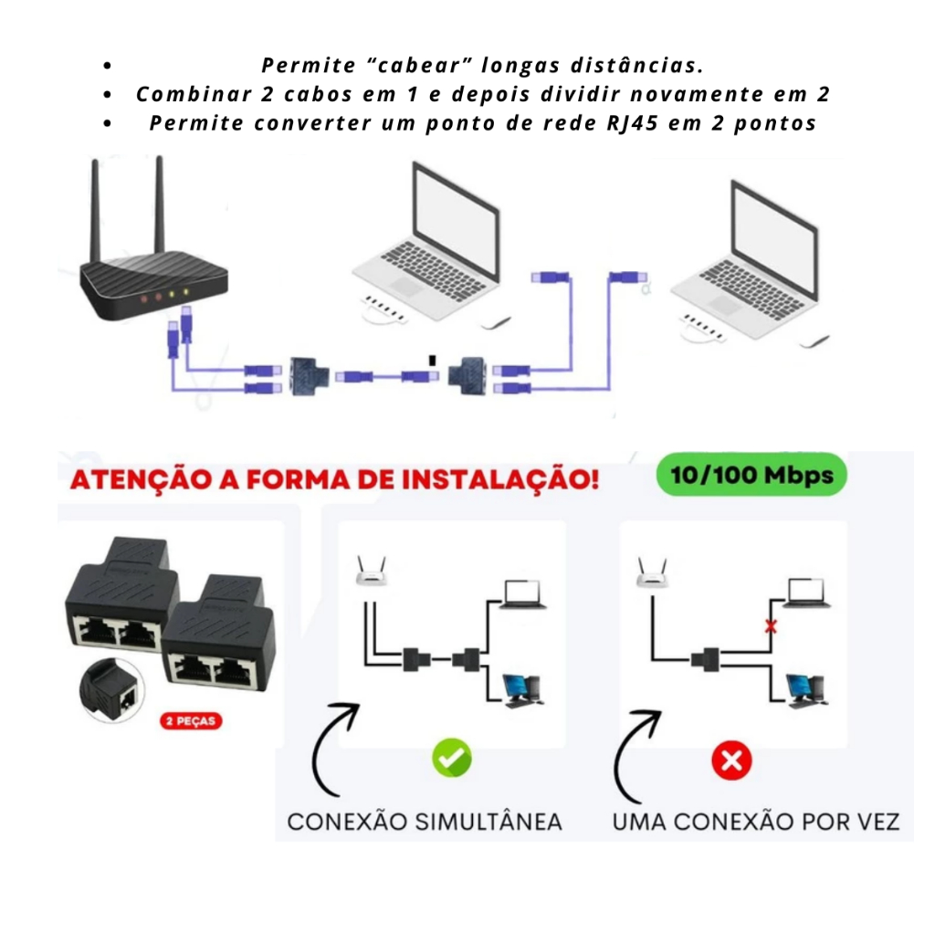 Conector Extensor Duplicador Divisor de Saída de Rede Rj45 Splitter 1x2 Plug T Preto + 2X Cabos de Rede 1 Metro Azul