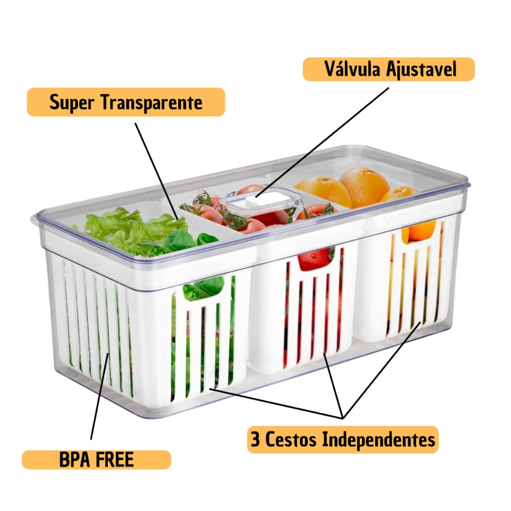 Kit 2 Organizador de Geladeira 6,8 Litros Com 3 Cesto Tampa Multiuso Alimentos Verduras e Vegetais