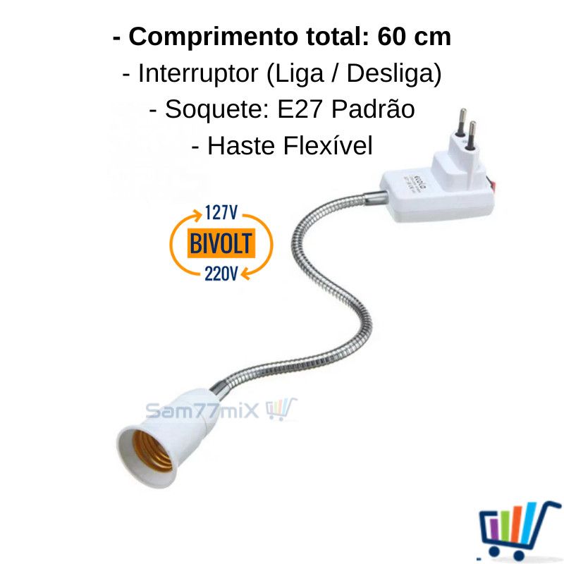 Soquete Flexível Para Lampada E27 Adaptador Extensão Com Tomada Bocal