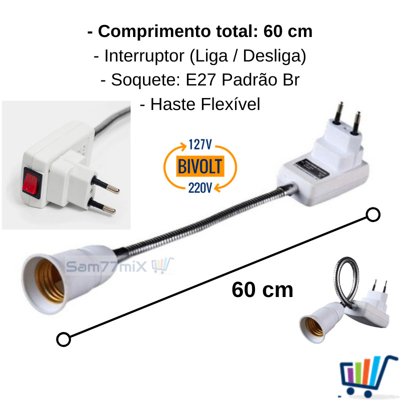 Soquete Flexível Para Lampada E27 Adaptador Extensão Com Tomada Bocal 60cm