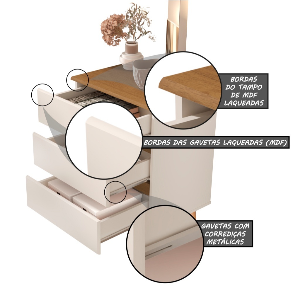 Mesa de Cabeceira Roma 3 Gavetas New Pés Palito Retrô Quarto