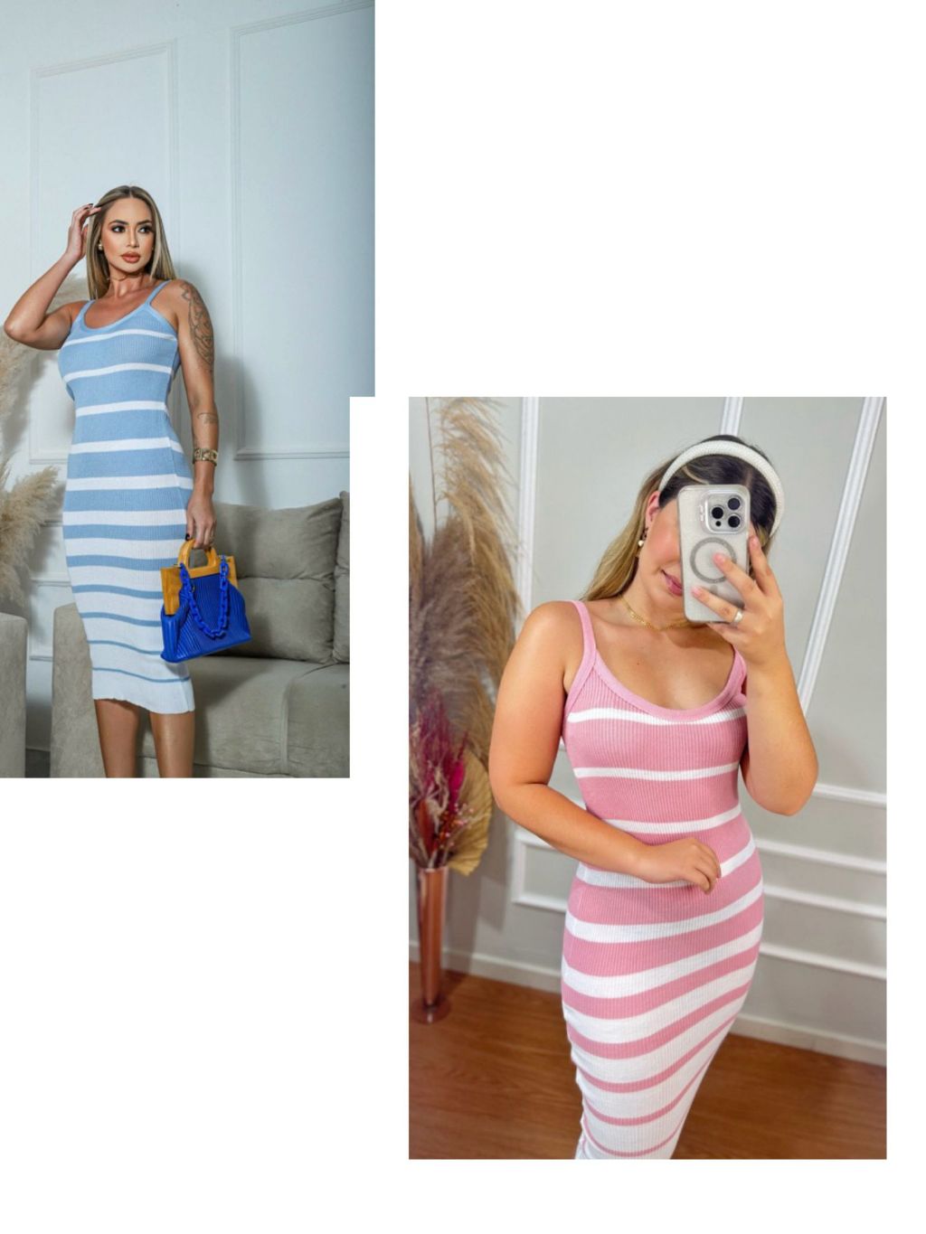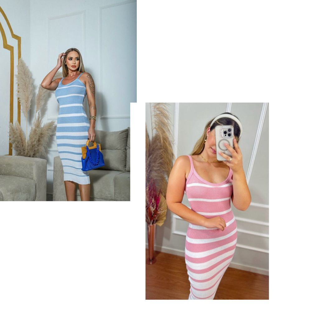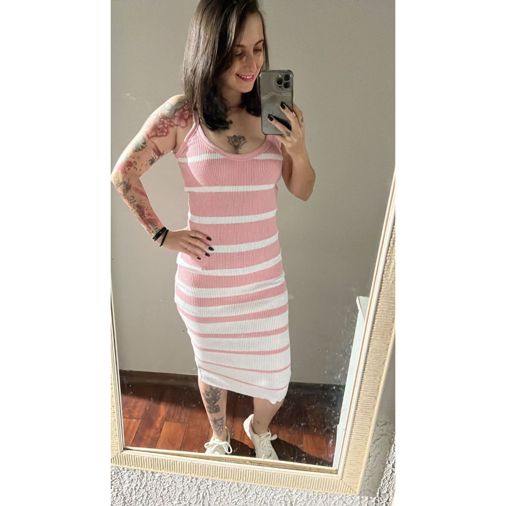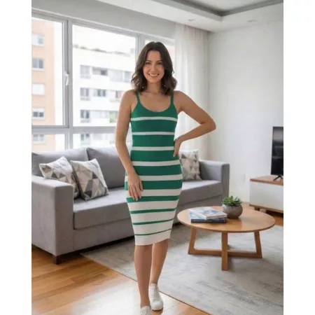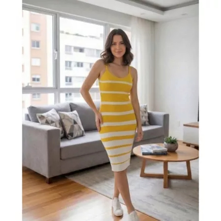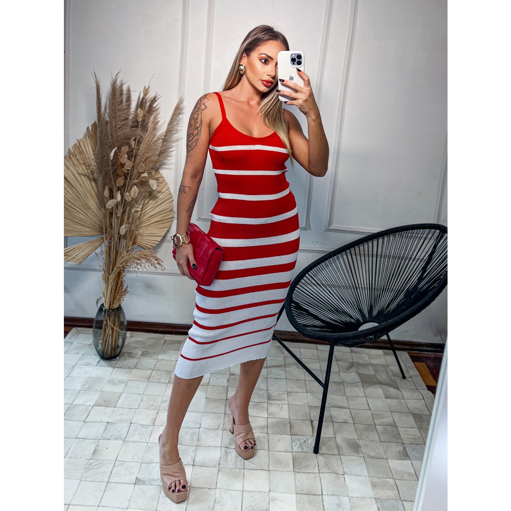Vestido Feminino Tricô Listrado Mídi Canelado com Alça Decote V 36 ao 42 Lupinacci Tricot