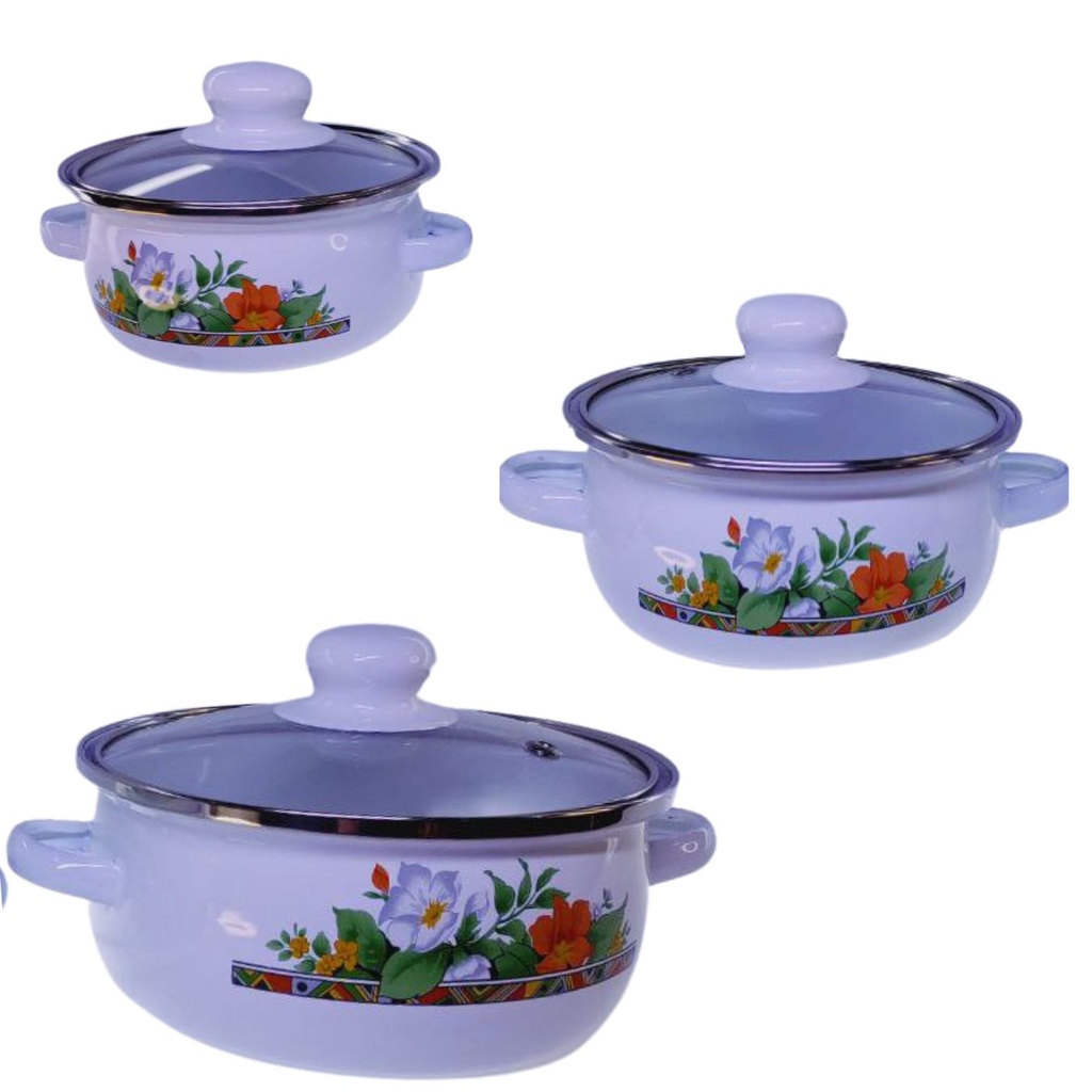 Jogo Caçarola Pequena 3 Peças Esmaltada Tampa De Vidro Flore