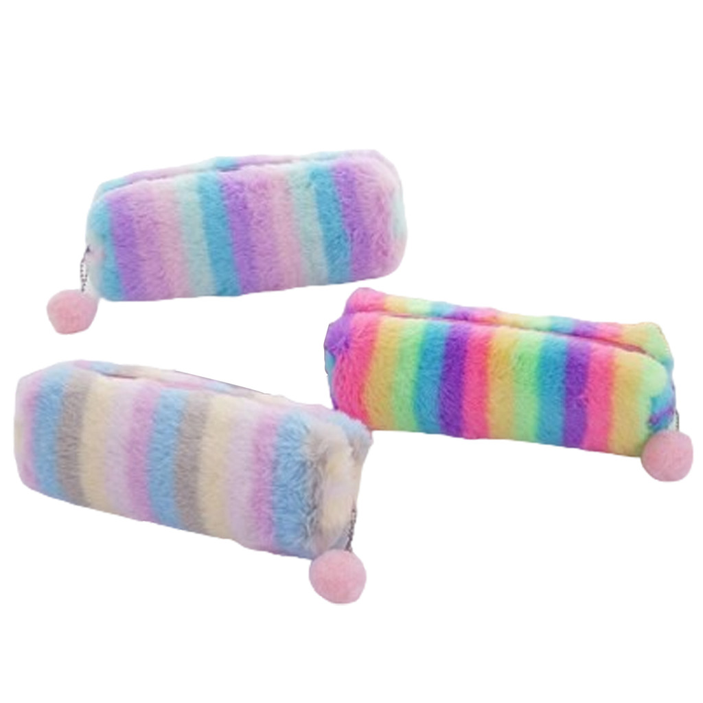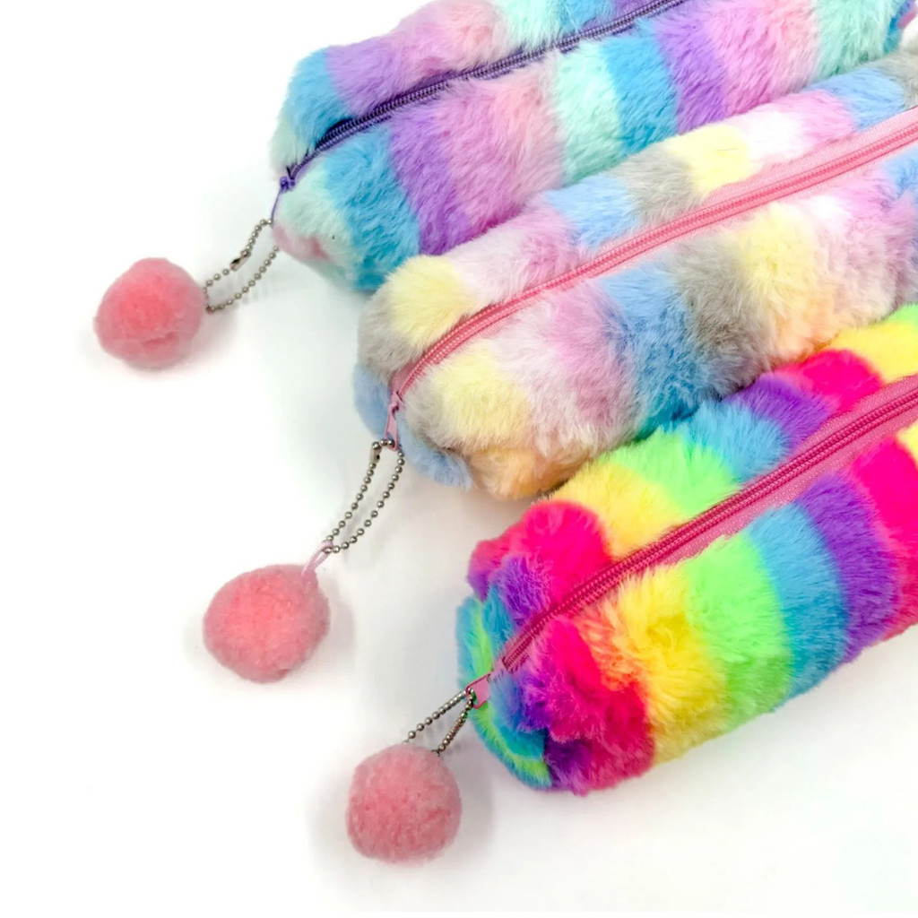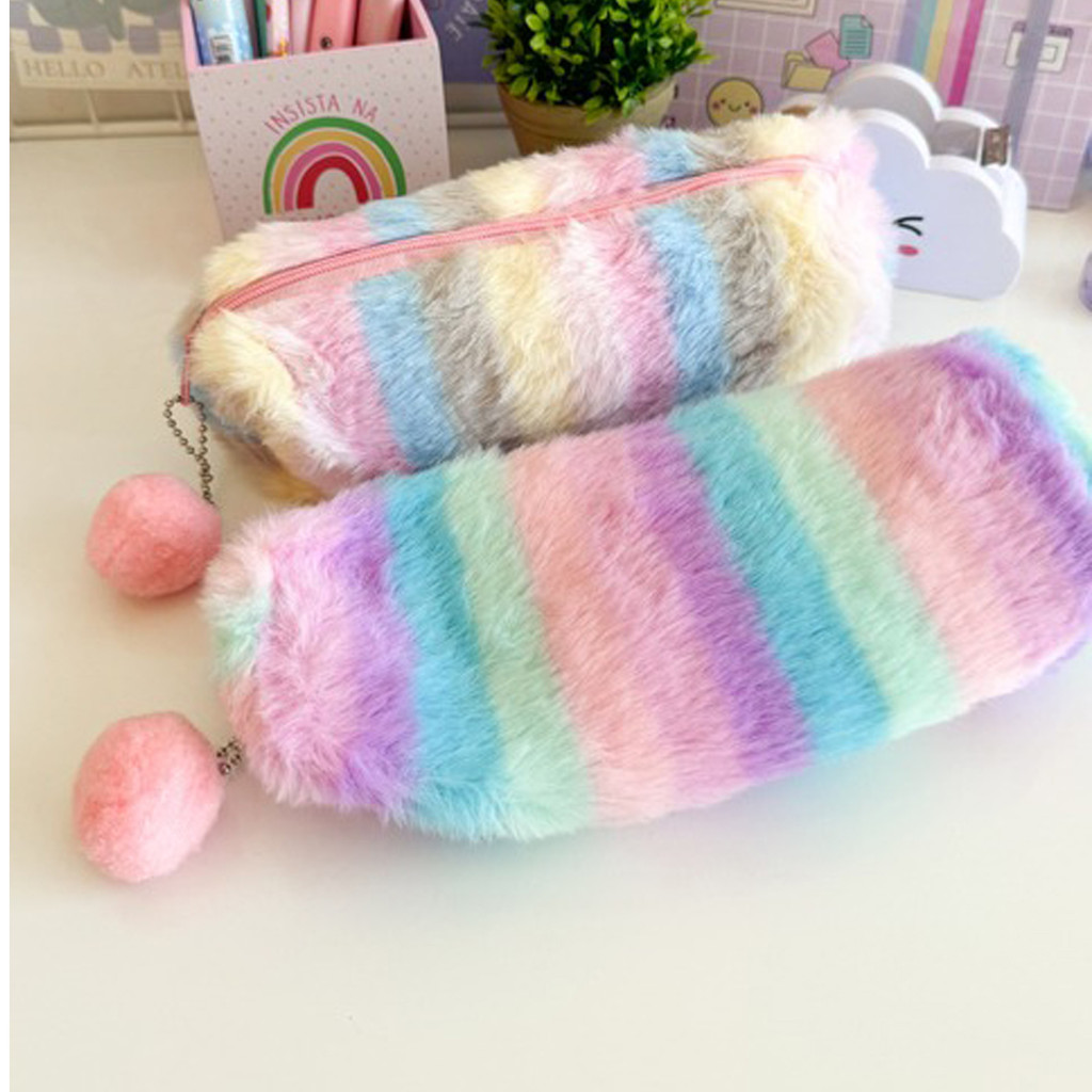 Estojo Escolar Feminino Colorido De Pelúcia Porta Lápis Canetas Objetos Pompom Zíper