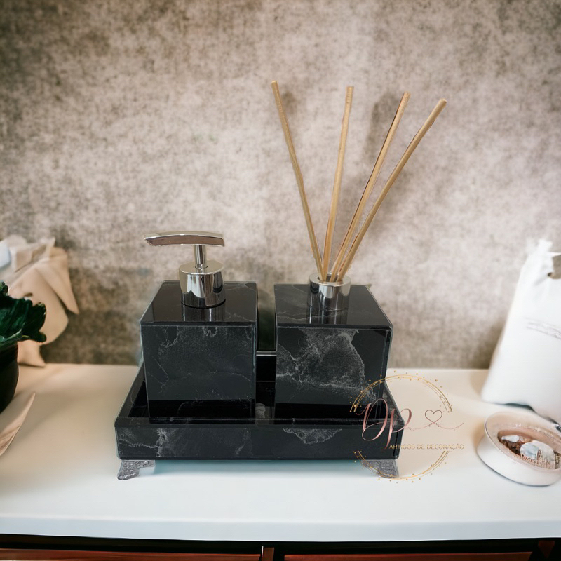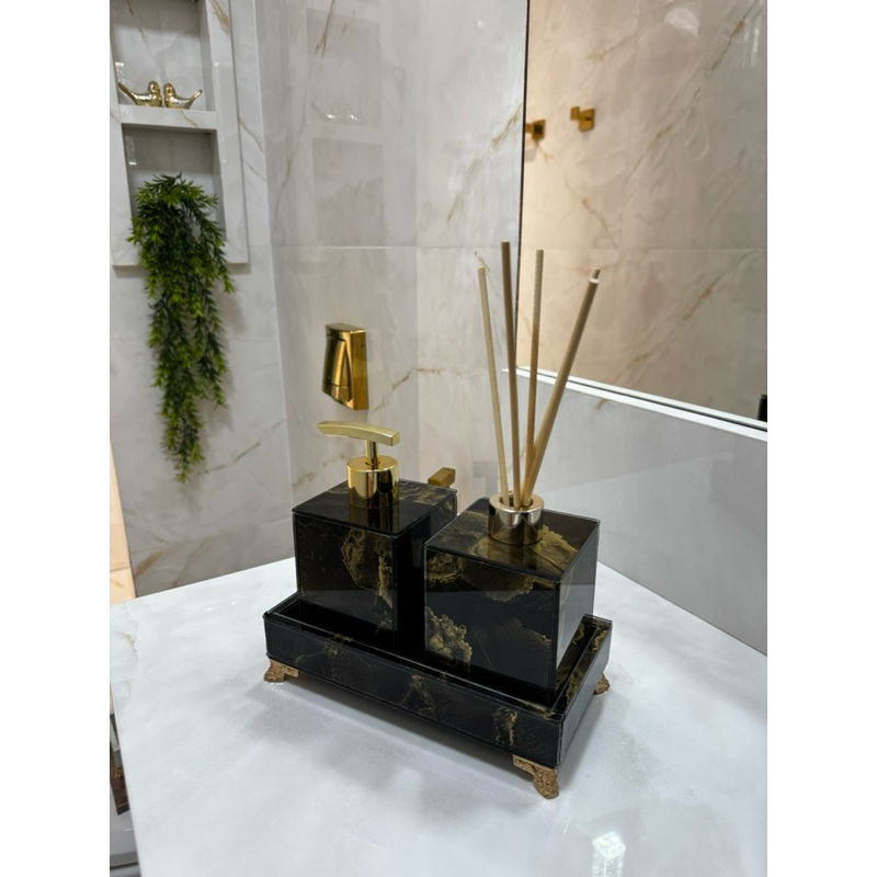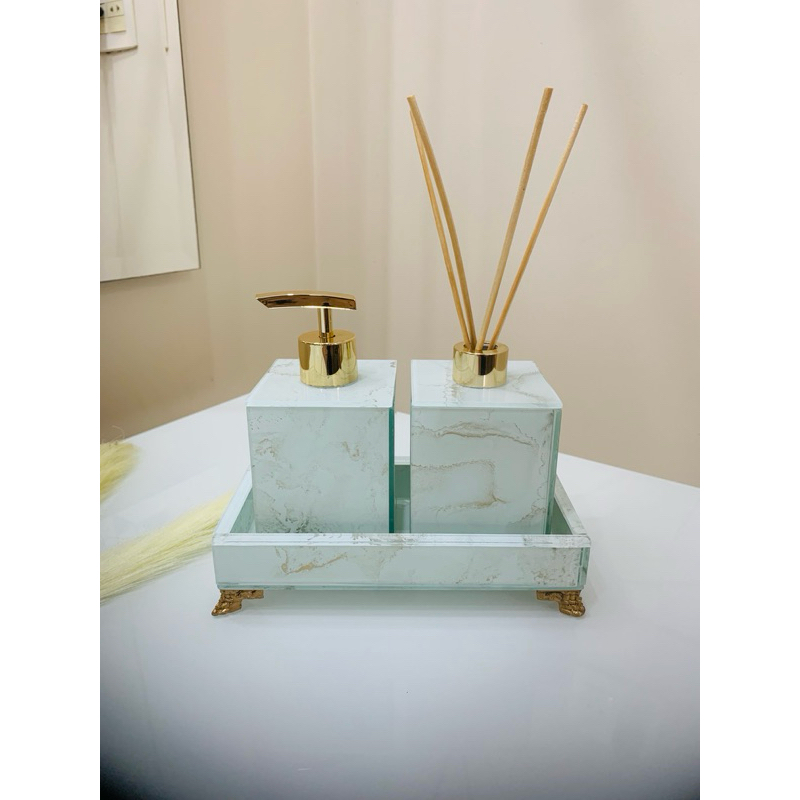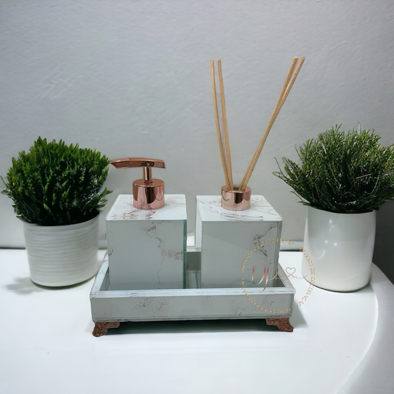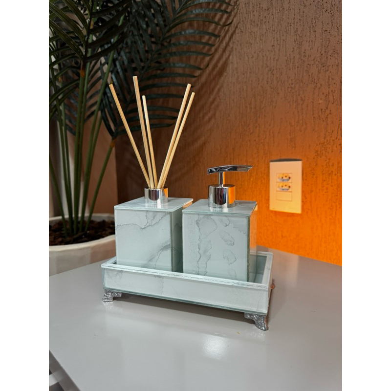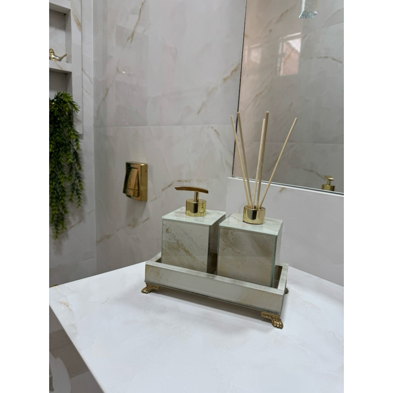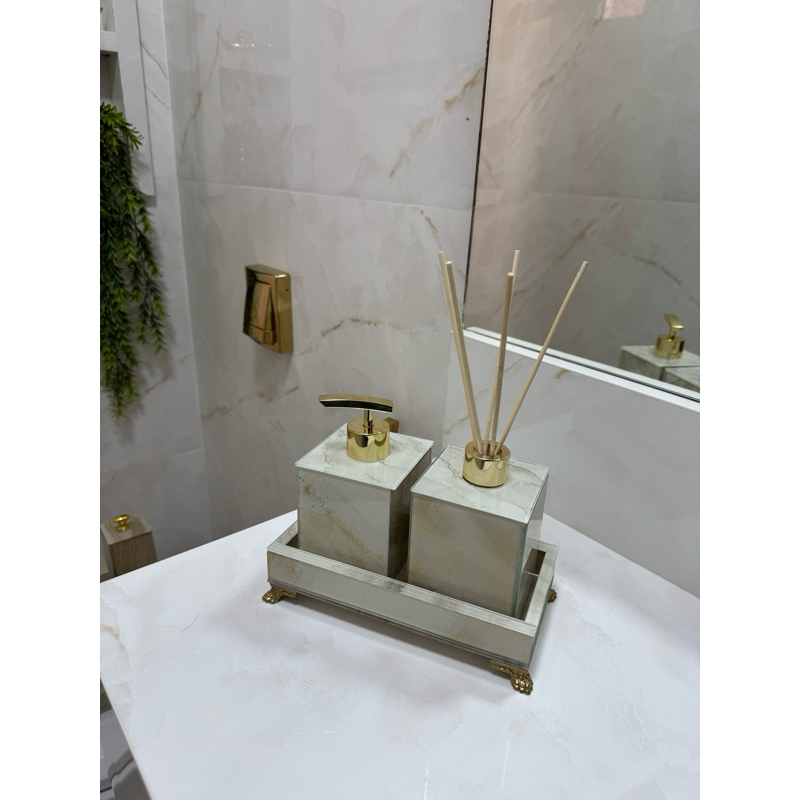 Kit Lavabo Banheiro Difusor Saboneteira e Bandeja 20x10cm Efeito Mármore Aromatizador Saboneteira Pump
