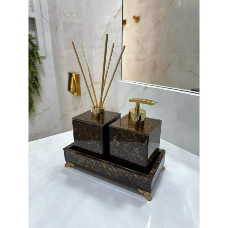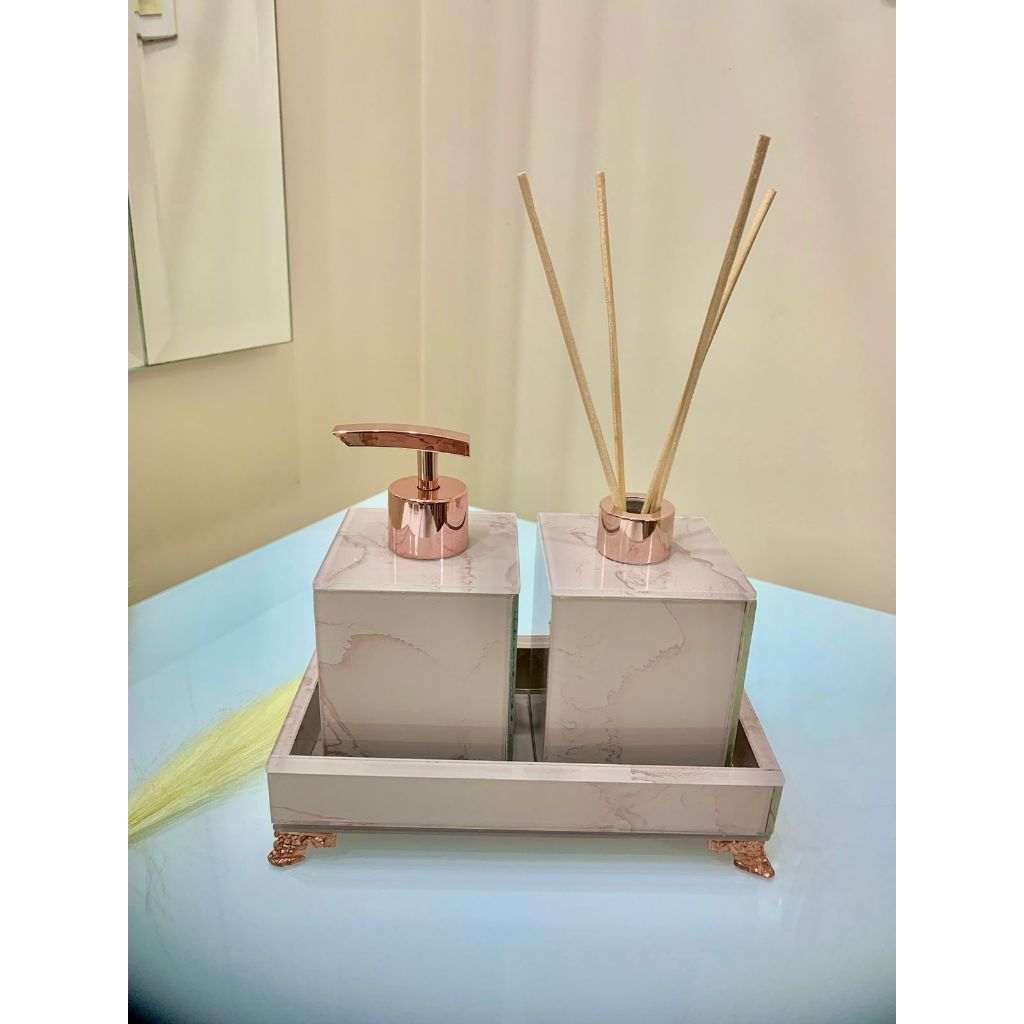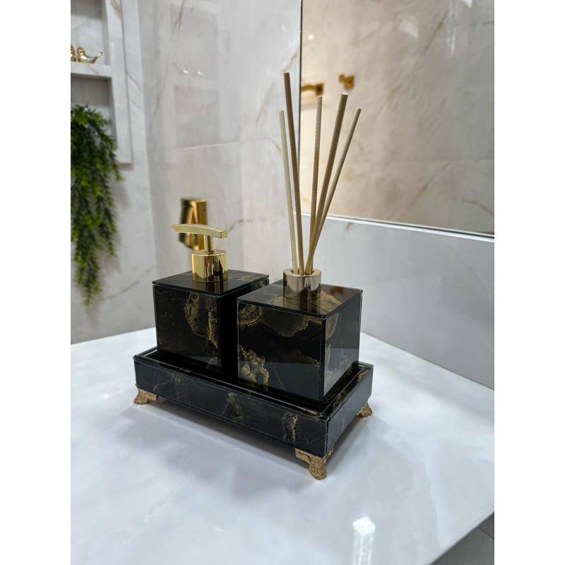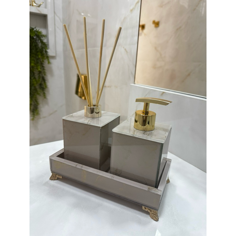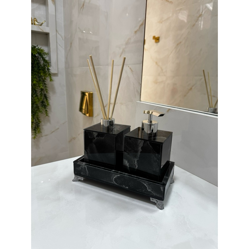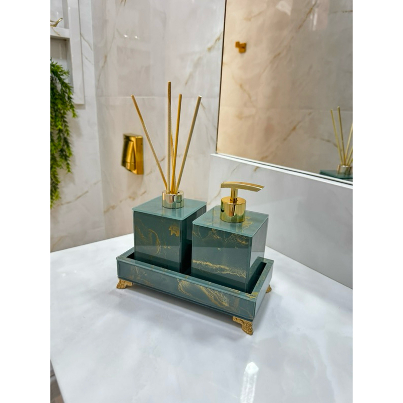 Kit Lavabo Banheiro Difusor Saboneteira e Bandeja 20x10cm Efeito Mármore Aromatizador Saboneteira Pump
