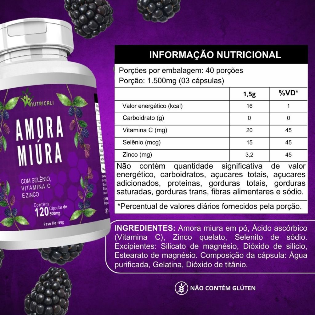Amora Miúra Com Selênio Vitamina C e Zinco 500mg 120 Cápsulas Saúde Nutricali