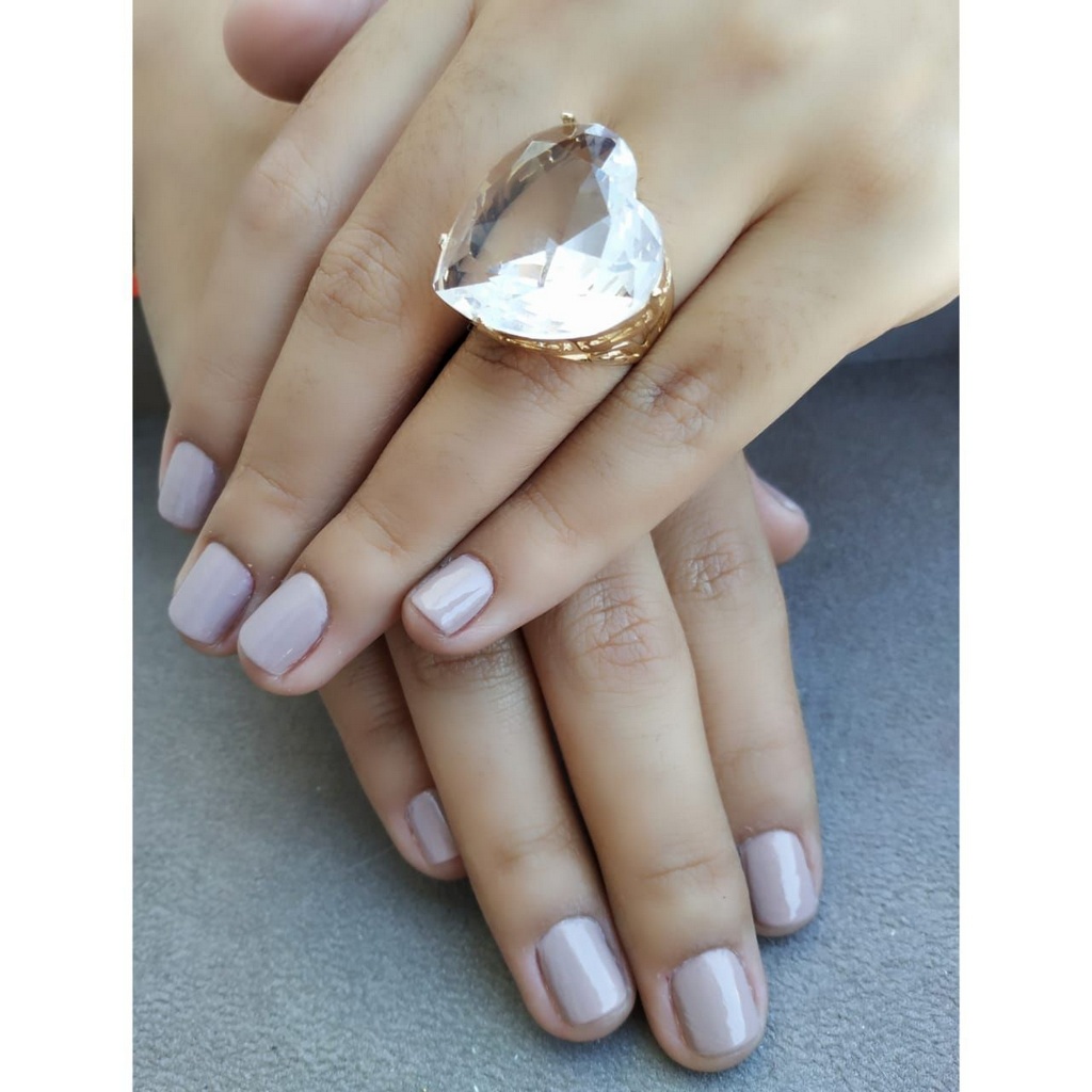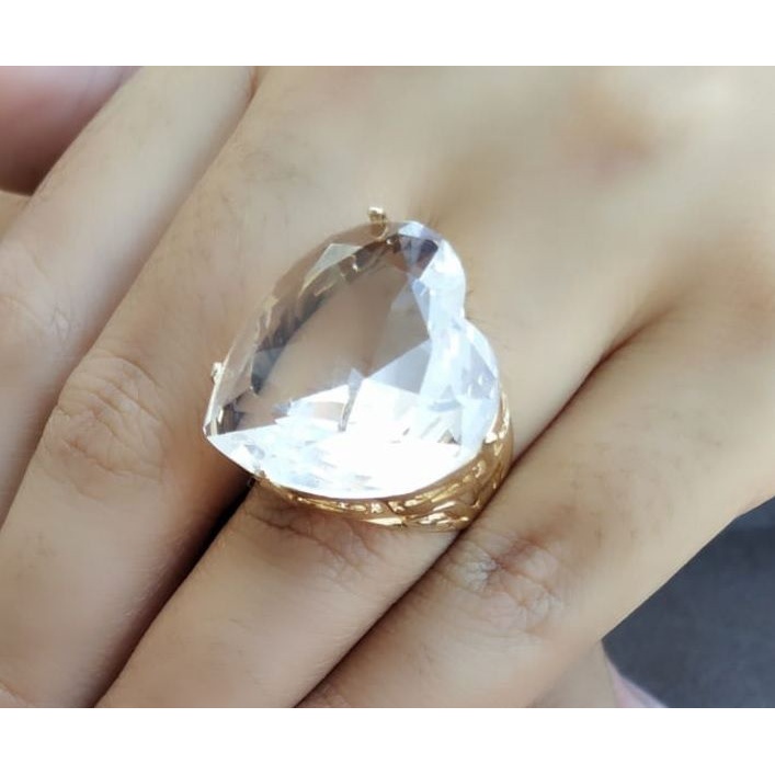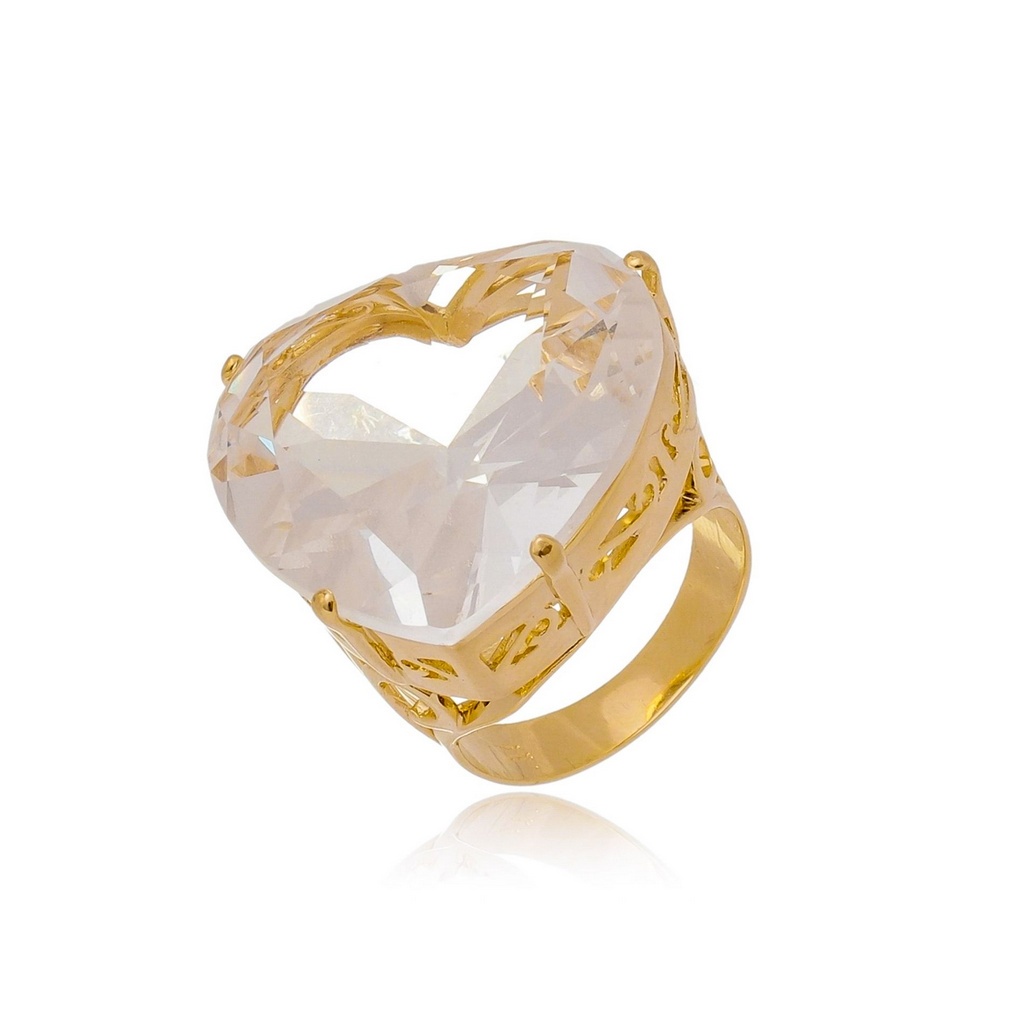 Anel de Coração Pedra Grande Cristal Branco Banhado a Ouro