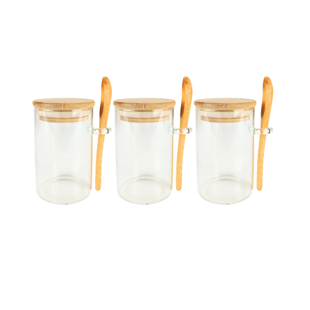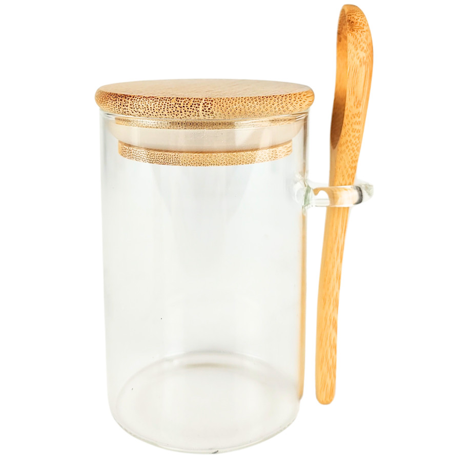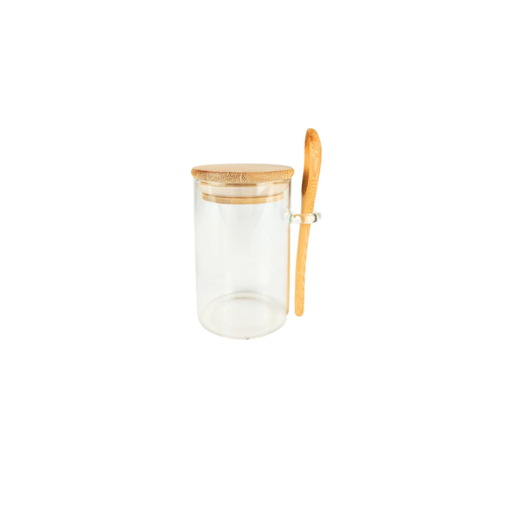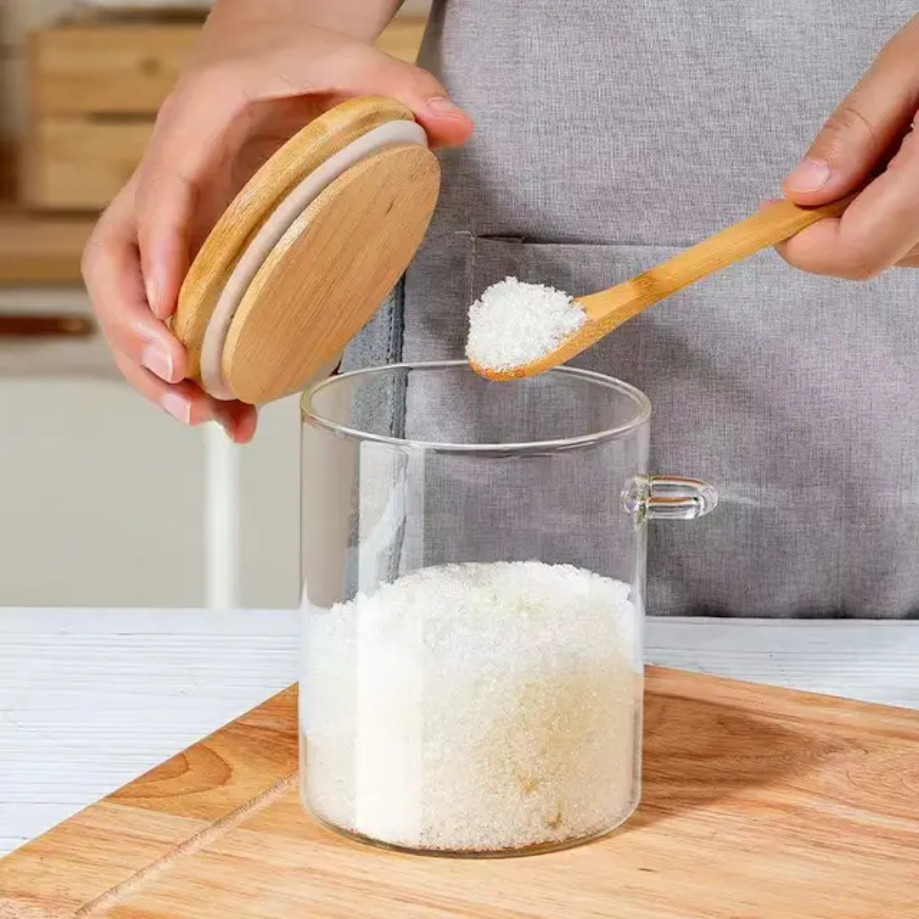 Pote Saleiro Açucareiro de Vidro Com Colher e Tampa Bambu