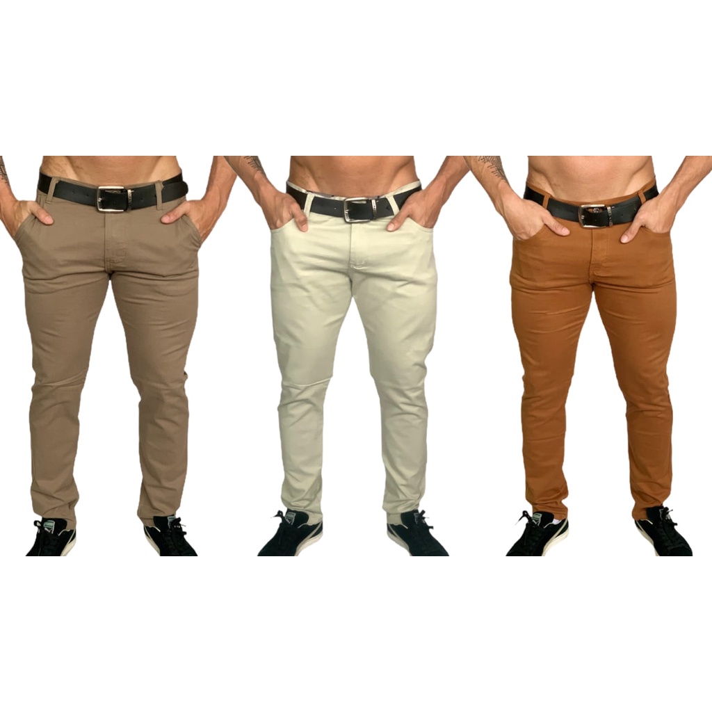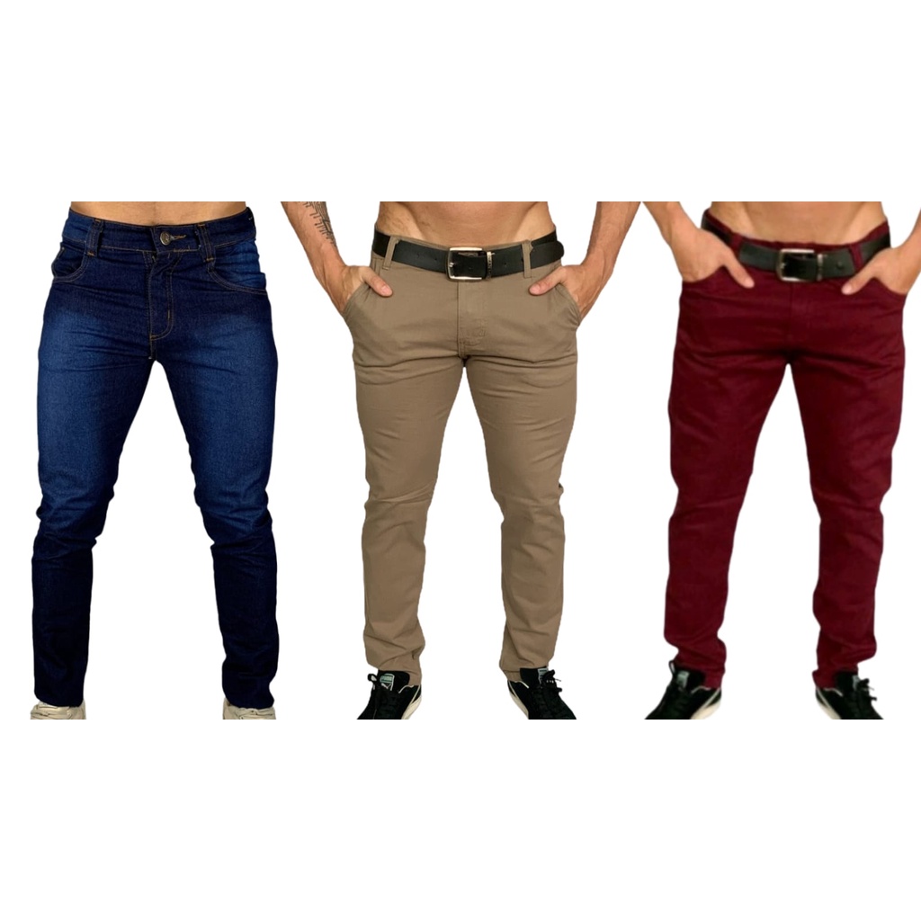 Kit 3 Calças Tradicionais Verde musgo Gelo e Bordô Slim FIt Sarja Sport Fino