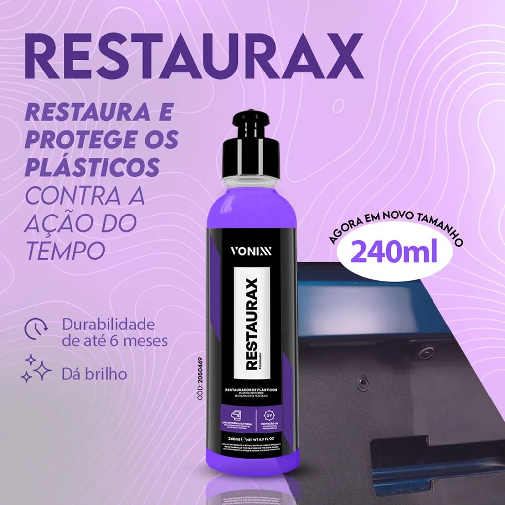 Vonixx Restaurax 240ml Restaurador Plásticos Borrachas Para-Choques Brilho Duradouro Automotivo
