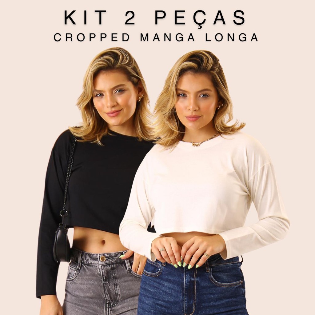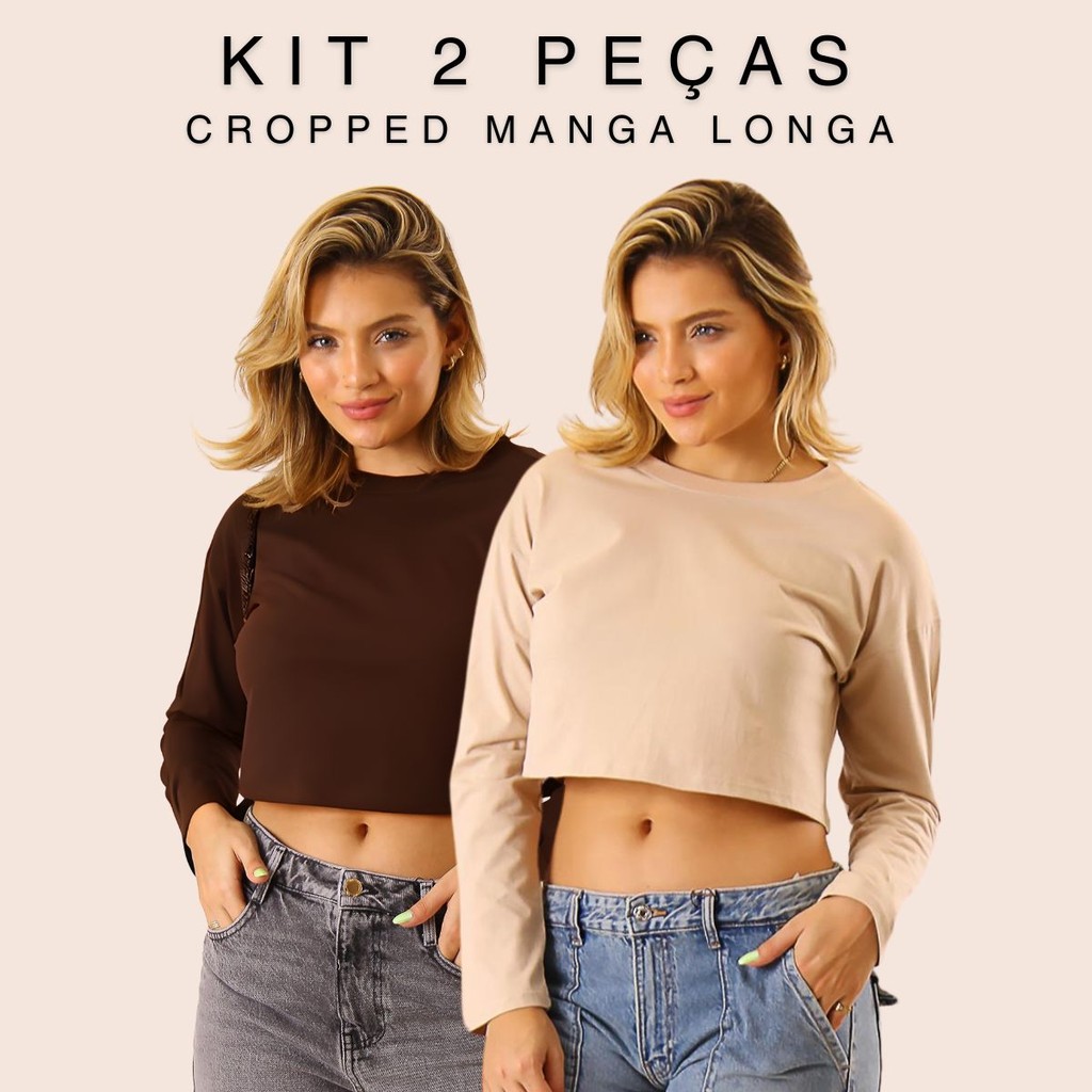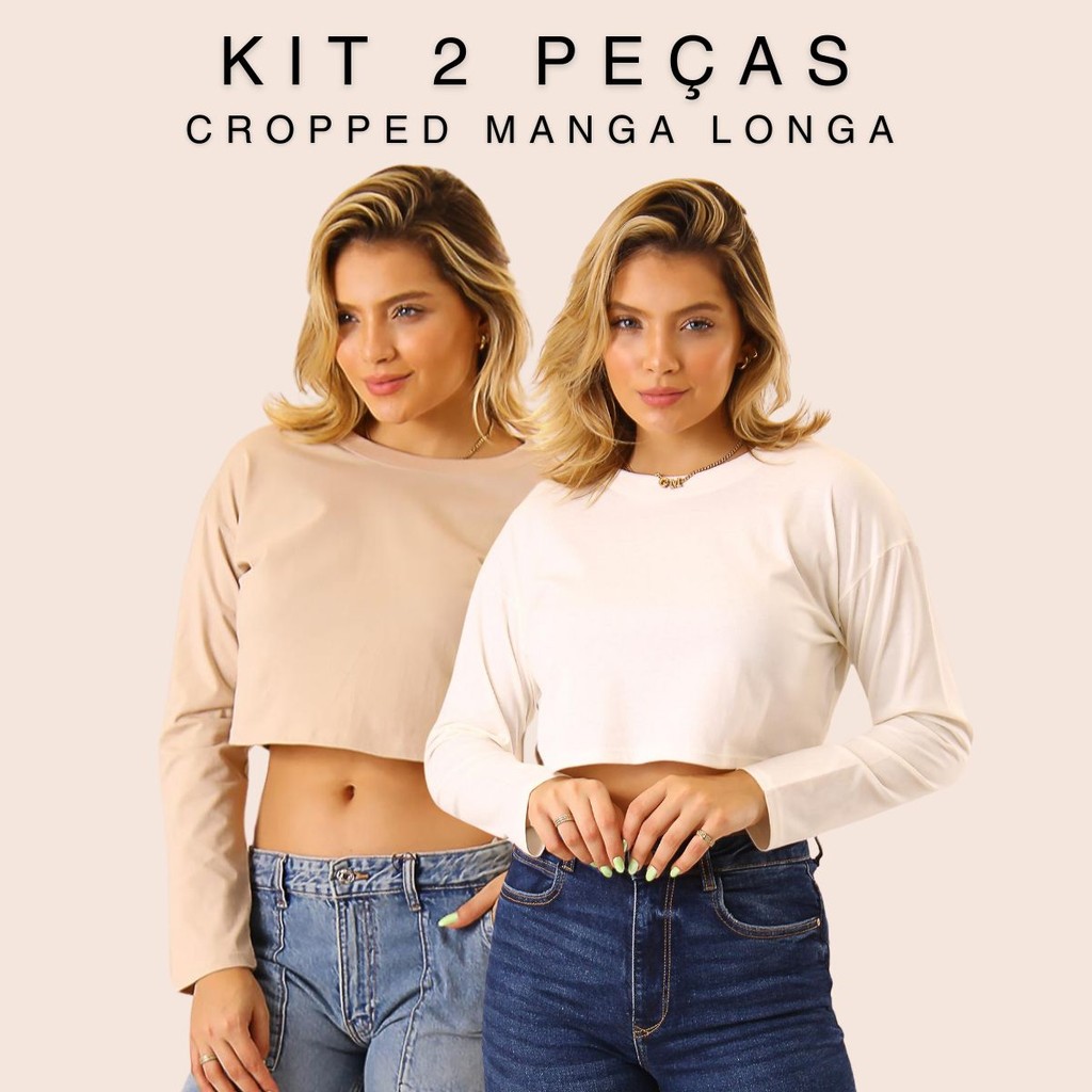 Kit 2 T-shirt Cropped Camiseta Manga Longa Oversized Blusa Feminina Outono Inverno Algodão Alba
