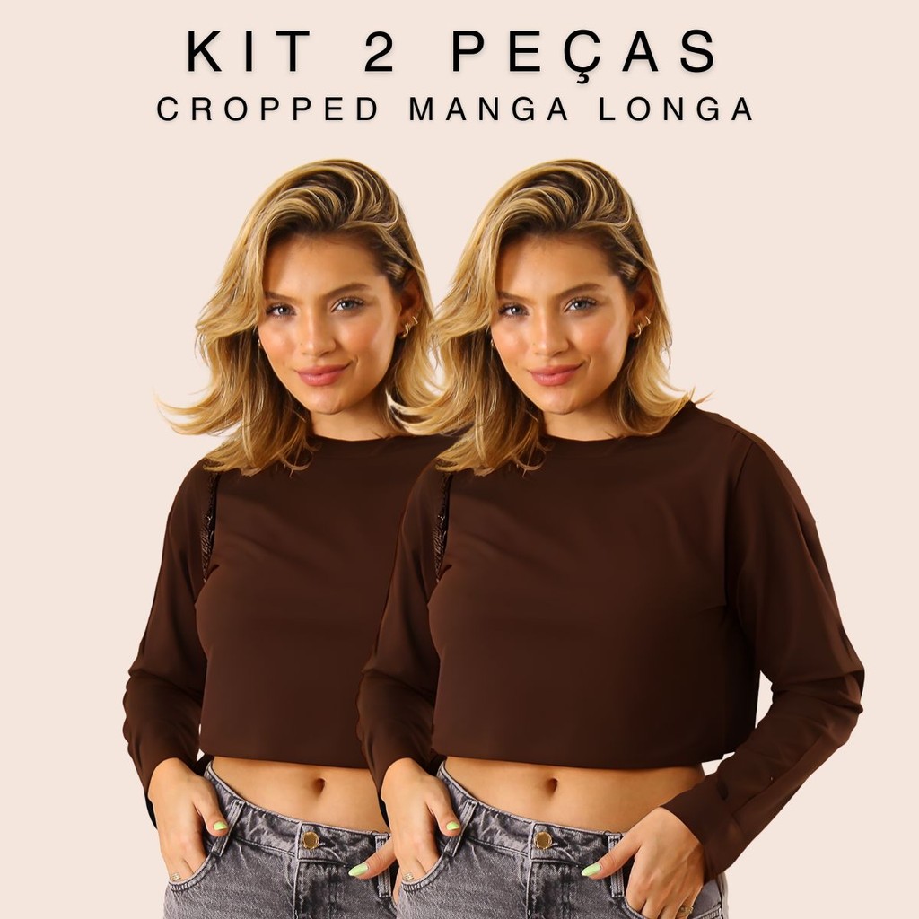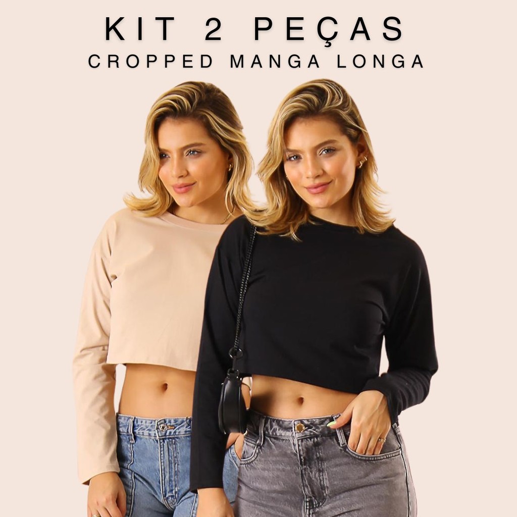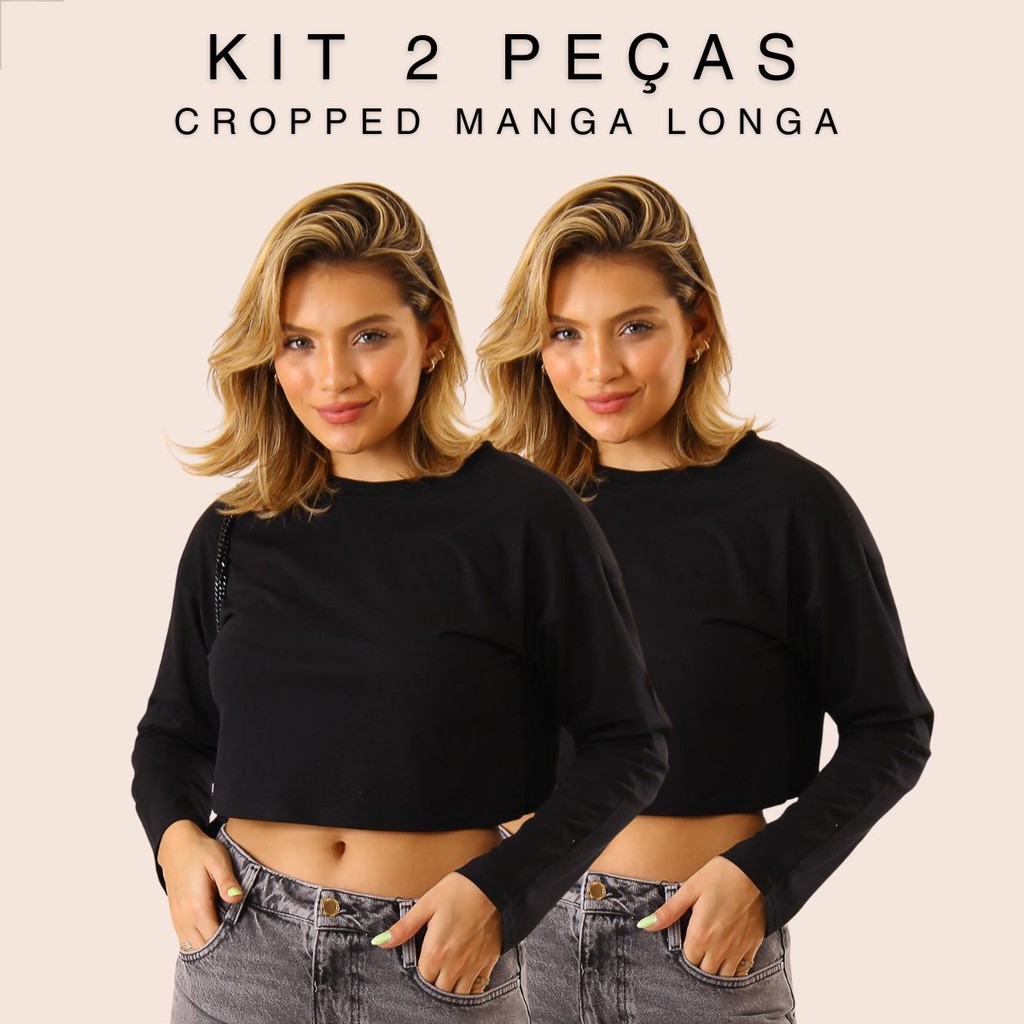 Kit 2 T-shirt Cropped Camiseta Manga Longa Oversized Blusa Feminina Outono Inverno Algodão Alba