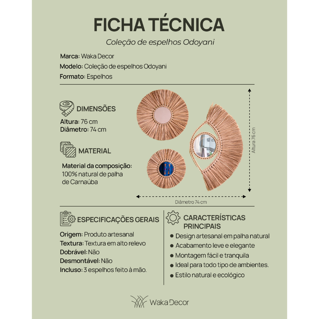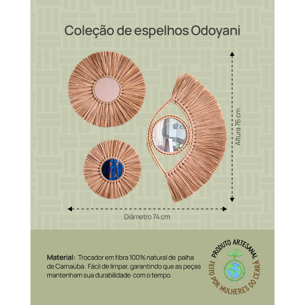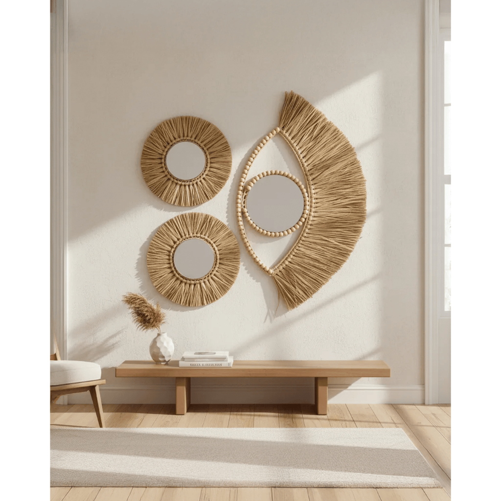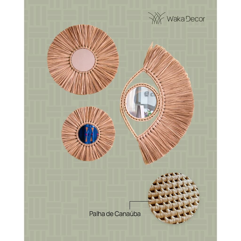Decoração Boho Chic Praia 3 Espelhos Redondos Palha Natural Composição de parede 74x72