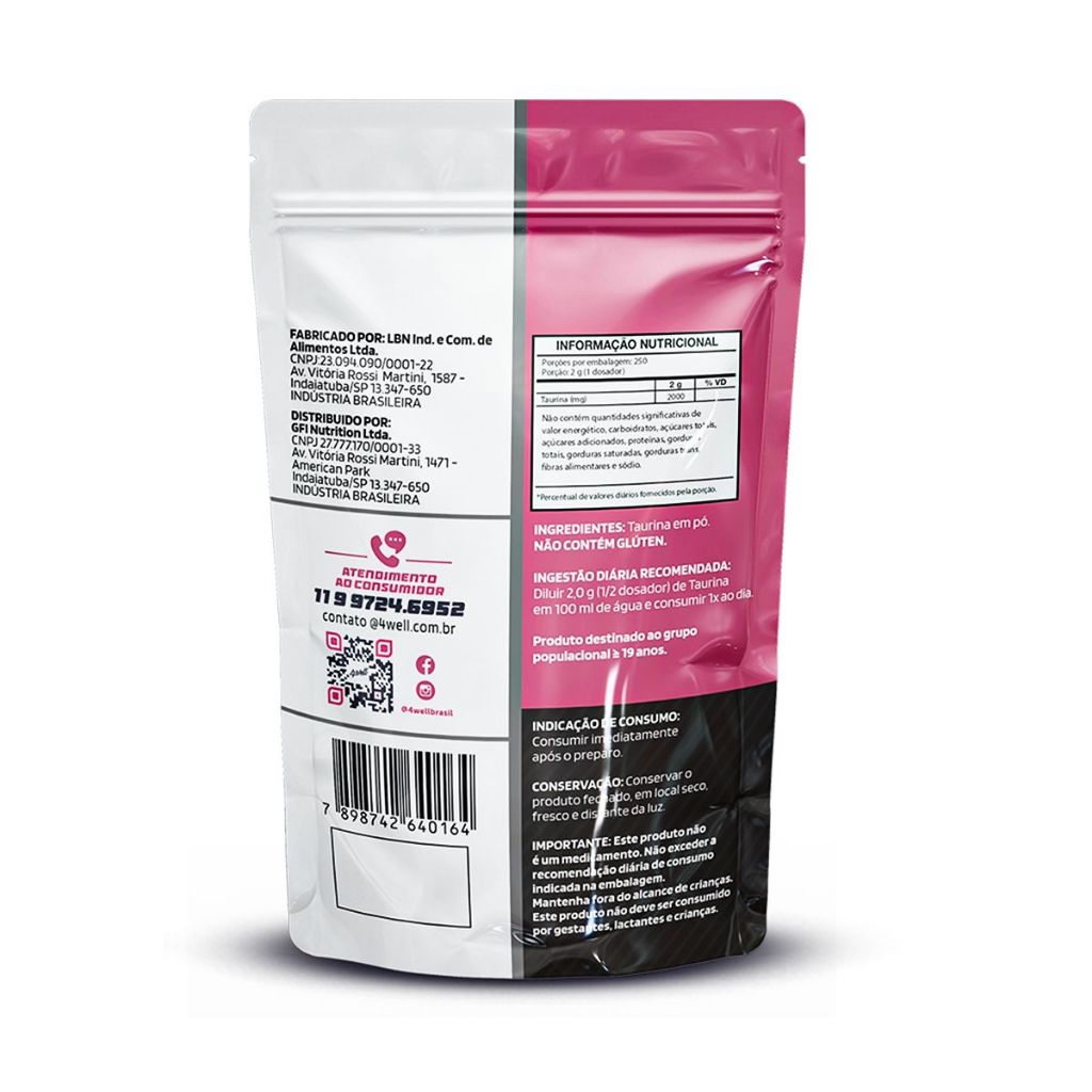 Taurina 500g 100% Pura Importada 4well Sabor Natural
