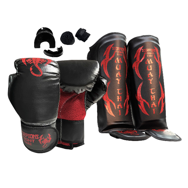Kit Completo Muay Thai Luva + Caneleira + Bandagem + Bucal + Sacola Brinde