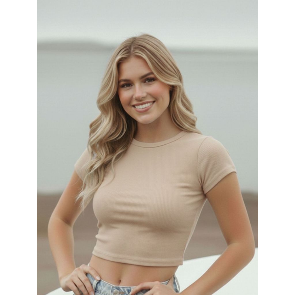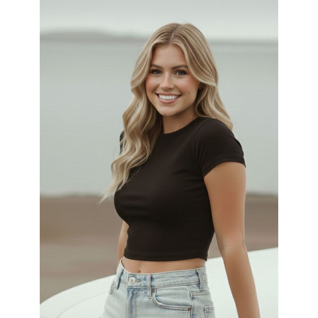 Top Blusinha Cropped Feminino Ribana Canelado Justo Manga Curta Estilo Gringa Básico e Confortável Moda Casual