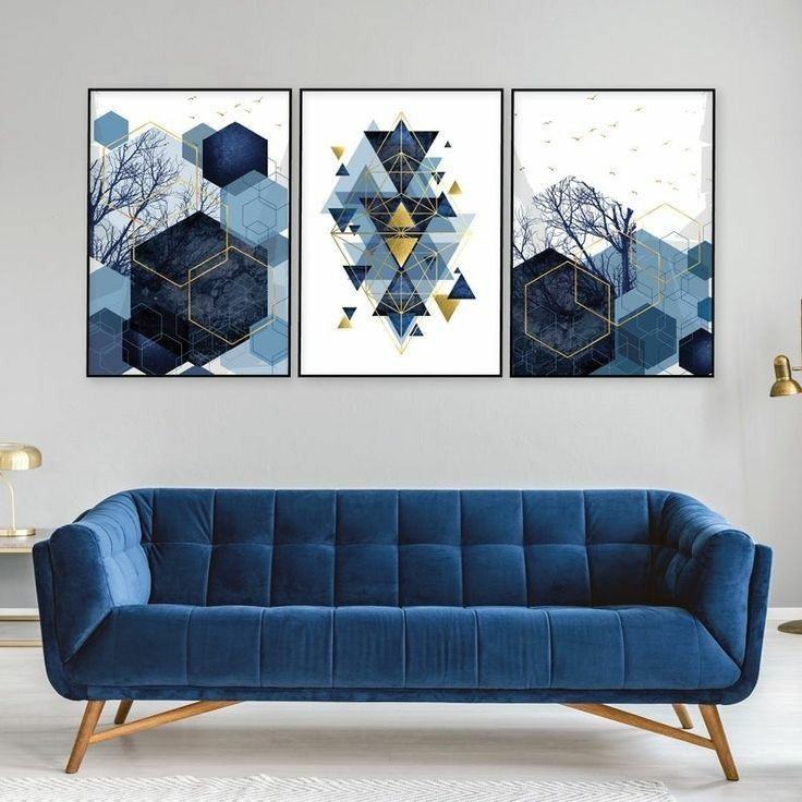 Quadro Decorativo Kit 03 Peças 70x50 Geométrico Azul Marinho Para Sala Quarto Escritório - Placas Sem Moldura