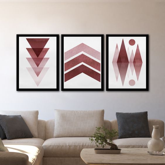 Quadro Decorativo 03 Peças 40x60 - Geometrico Tons de Marçala - Placas Sem Moldura Para Decorar Qualquer Ambiente