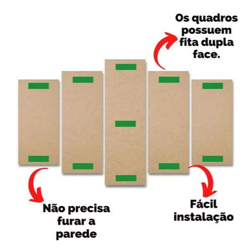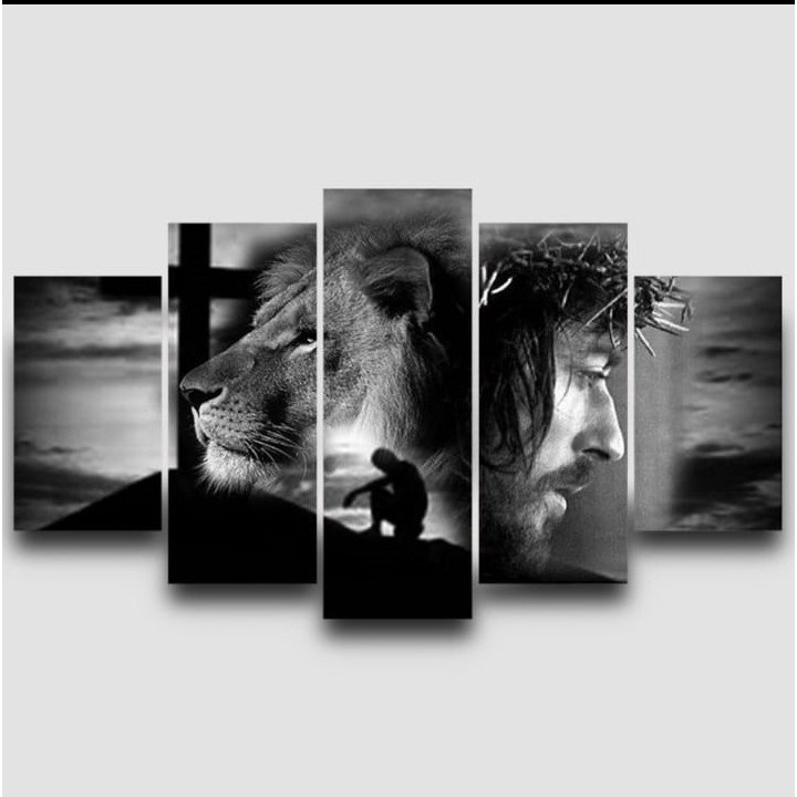 Quadro Decorativo Mosaico 05 Peças - Religioso Jesus Cristo Leão de Judá Cruz - Placas de MDF Sem Moldura Para Decoração de Ambientes