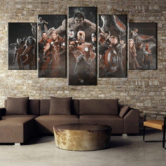 Quadro Decorativo Mosaico 05 Peças Super Heróis Marvel Vingadores Decoração Para Sala Quarto / Sem Moldura MDF 3mm