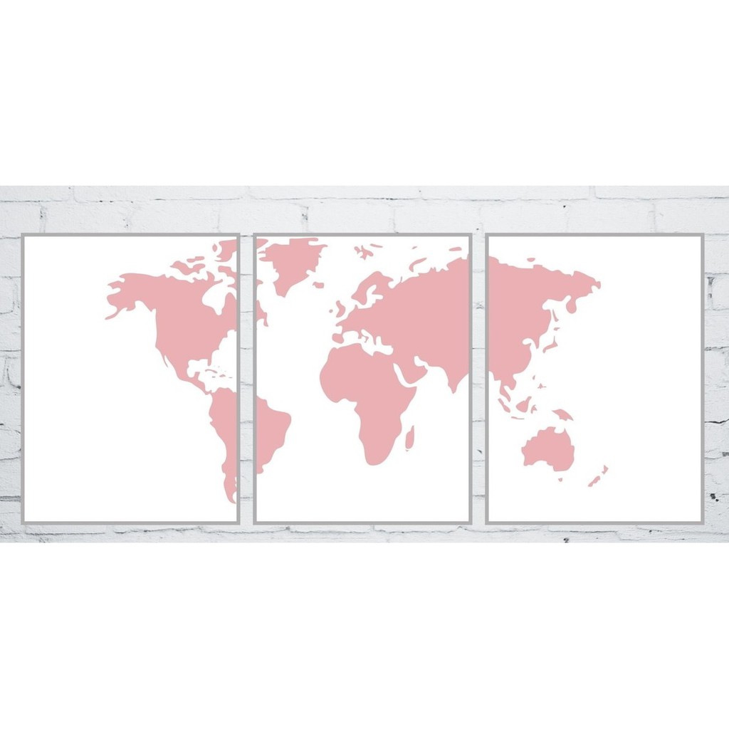 Quadro Decorativo Mosaico 03 Peças 40x60 - Mapa Mundi Rosa Fundo Branco - Placas Sem Moldura