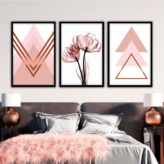 Quadro Decorativo Kit 03 Peças 40x60 Flor Triângulos Rose Para Quarto Sala Escritório - Sem Moldura