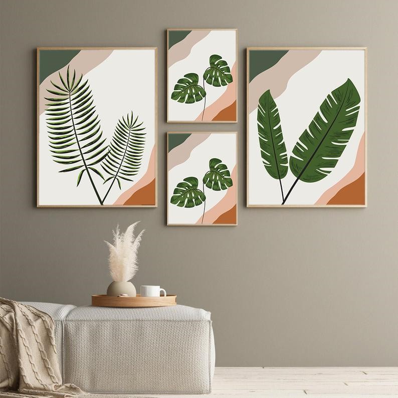 Quadro Decorativo Kit 04 Peças Folhagem Verde e Detalhes Laranja Estilo Boho Para Sala Quarto Escritório - Sem Moldura