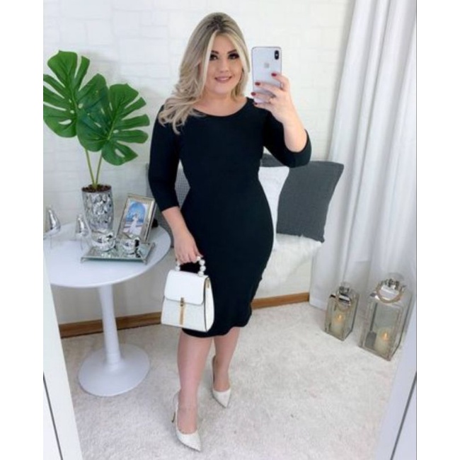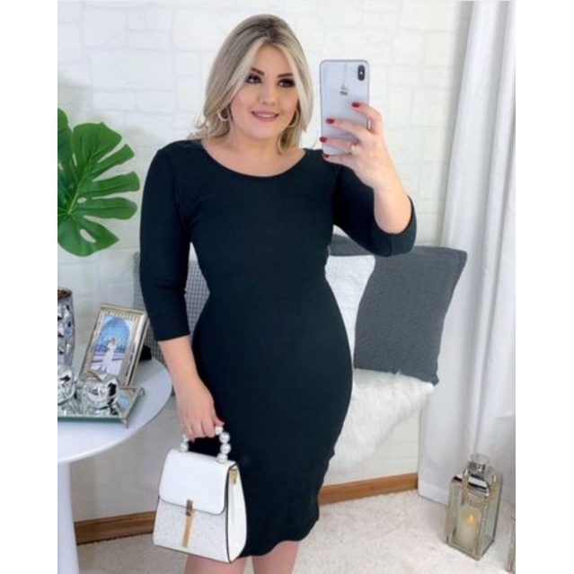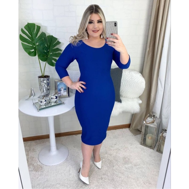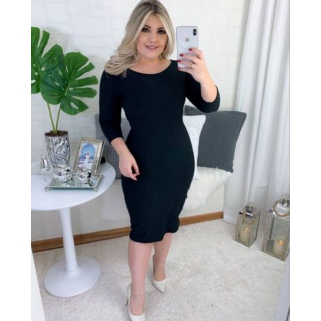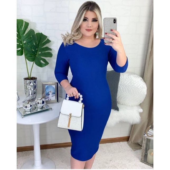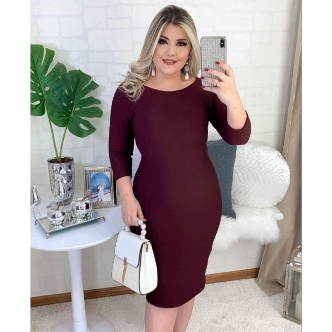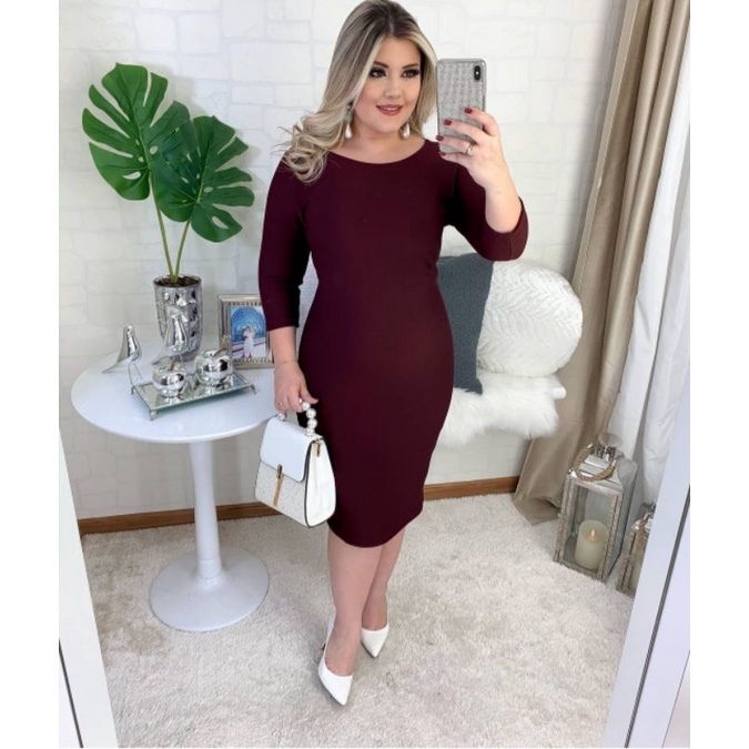 Vestido Midi Plus Size Tubinho Manga 3/4 Moda Evangélica Feminina