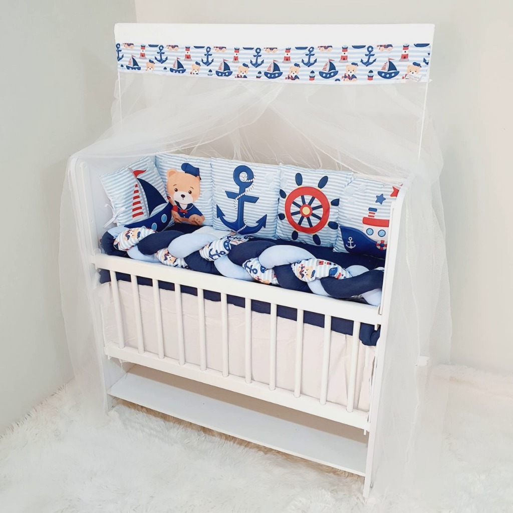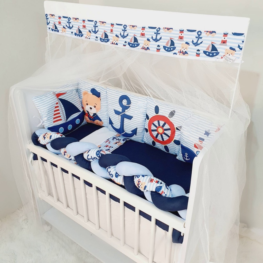 Kit Mini Berço com 12 peças + Saia de Berço Bebê Menino Marinheiro